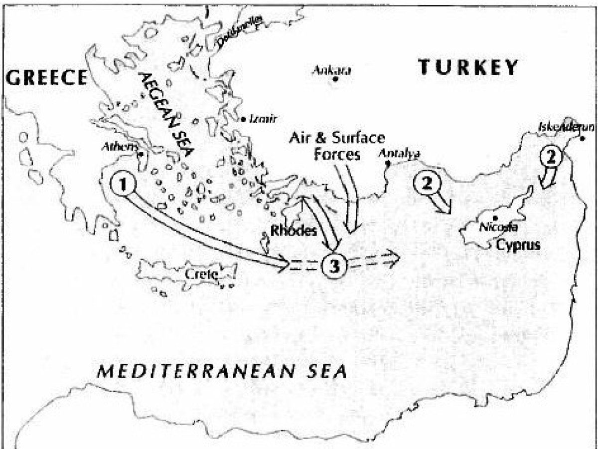Senaryoya göre Yunanistan, Güney Kıbrıs’a taktik balistik füzeler yerleştirme kararı alıyor. Türkiye, bunun olmaması yönünde Atina’yı sert şekilde uyarıyor. Geri adım atmayıp Kıbrıs’a doğru dümen kıran Yunan gemileri Türk ordusunca batırılıyor.