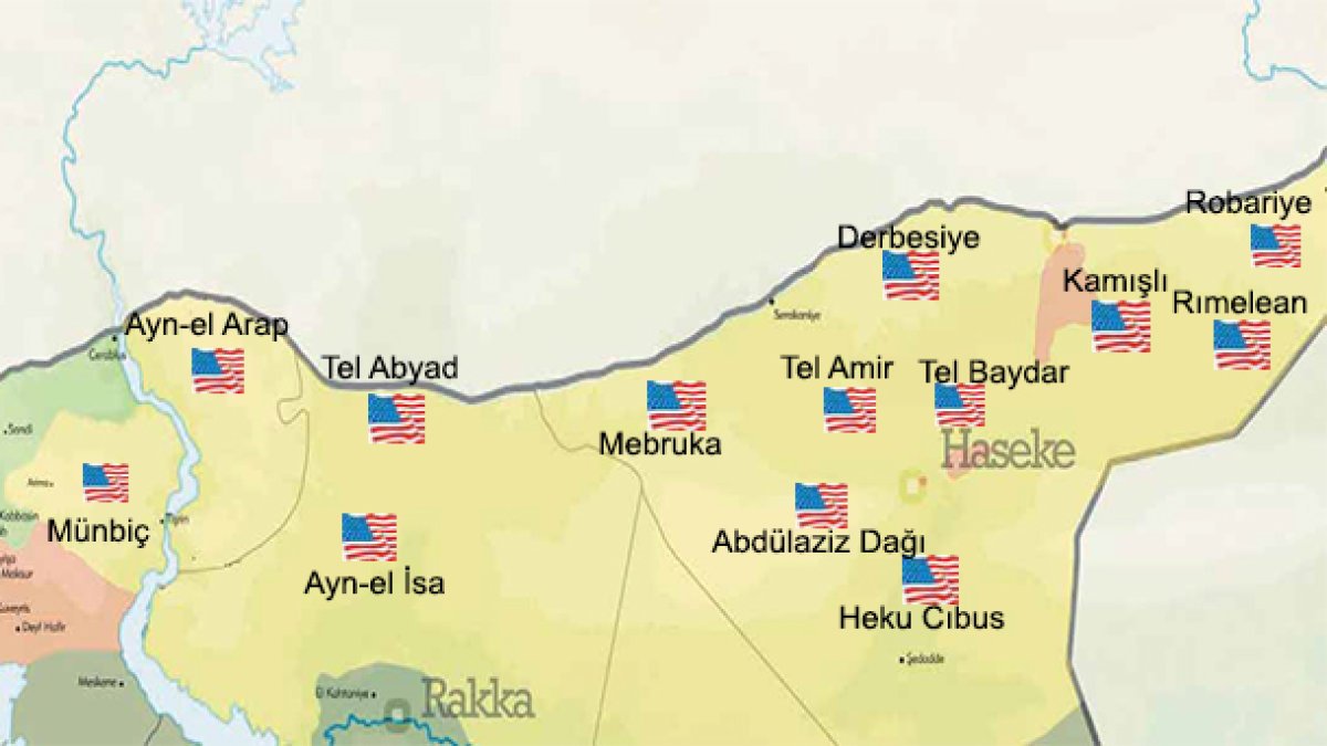 Suriye’nin kuzeyinde PKK’nın Suriye uzantısı PYD/YPG’yi koruma altına alan ABD’nin bölgede 13 karargâh ve üssü bulunuyor. Münbiç’ten Derik’e kadar karargâhlar kuran ABD, Türkiye’yi ve bölge ülkelerini bu merkezlerden tehdit ediyor. ABD’nin sözde Kobani kantonu olarak adlandırılan bölgede 3, Haseke bölgesinde 9 ve Münbiç’te 1 karargâhı bulunuyor.