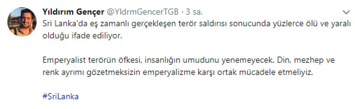 Sri Lanka’da gerçekleşen terör saldırılarına karşı Genel Başkanımız Yıldırım Gençer, sosyal medya hesabından bir mesaj yayınladı. Genel Başkanımız Yıldırım Gençer “Sri Lanka’da eş zamanlı gerçekleşen terör saldırısı sonucunda yüzlerce ölü ve yaralı olduğu ifade ediliyor. Emperyalist terörün öfkesi, insanlığın umudunu yenemeyecek. Din, mezhep ve renk ayrımı gözetmeksizin emperyalizme karşı ortak mücadele etmeliyiz.”