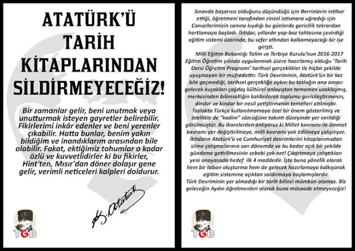 TGB Ege Üniversitesi Eğitim Fakültesi Birimi, Milli Eğitim Bakanlığı Talim Terbiye Kurulu’nun 2016-2017 Eğitim-Öğretim yılında uygulanmak üzere hazırlamış olduğu ‘Tarih Dersi Öğretim Programı” içerisinde Mustafa Kemal Atatürk’ün bir kez dahi adının geçmemesi üzerine kollarını sıvadı ve üniversiteyi “Atatürk’ü Tarih Kitaplarından Sildirmeyeceğiz” bildirieriyle donattı.