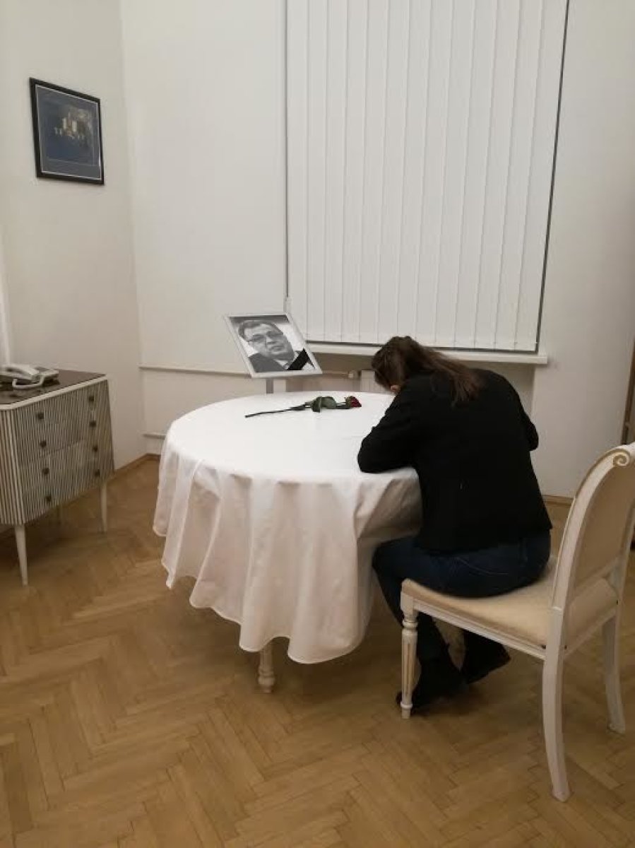 Rus elcilik görevlilerine, Avusturya'da yaşayan Türk halkını temsilen geldiklerini beyan eden Emre Er ve Elif Baykal, sıcak karşılandı. TGB heyetine Andrej Karlow için hazırlanan taziye defterine duygularını ve düşüncelerini yazma imkanı sunuldu.