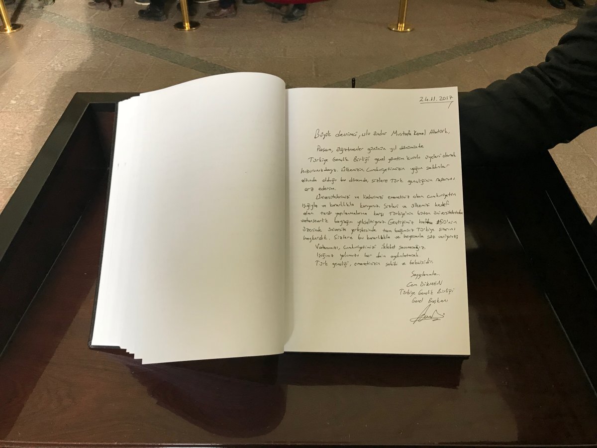 24 Kasım Öğretmenler Gününde Ankara’da bir araya gelen TGB Genel Yönetim Kurulu, Başöğretmenimiz Gazi Mustafa Kemal Atatürk’ün ebedi istirahatgahı olan Anıtkabir’i ziyaret etti. Anıtkabir’de düzenlenen resmi törende mozaleye çelenk bırakan Genel Başkanımız Cem Dikmen, törenin ardından Anıtkabir Özel Defterine şu notları yazdı: