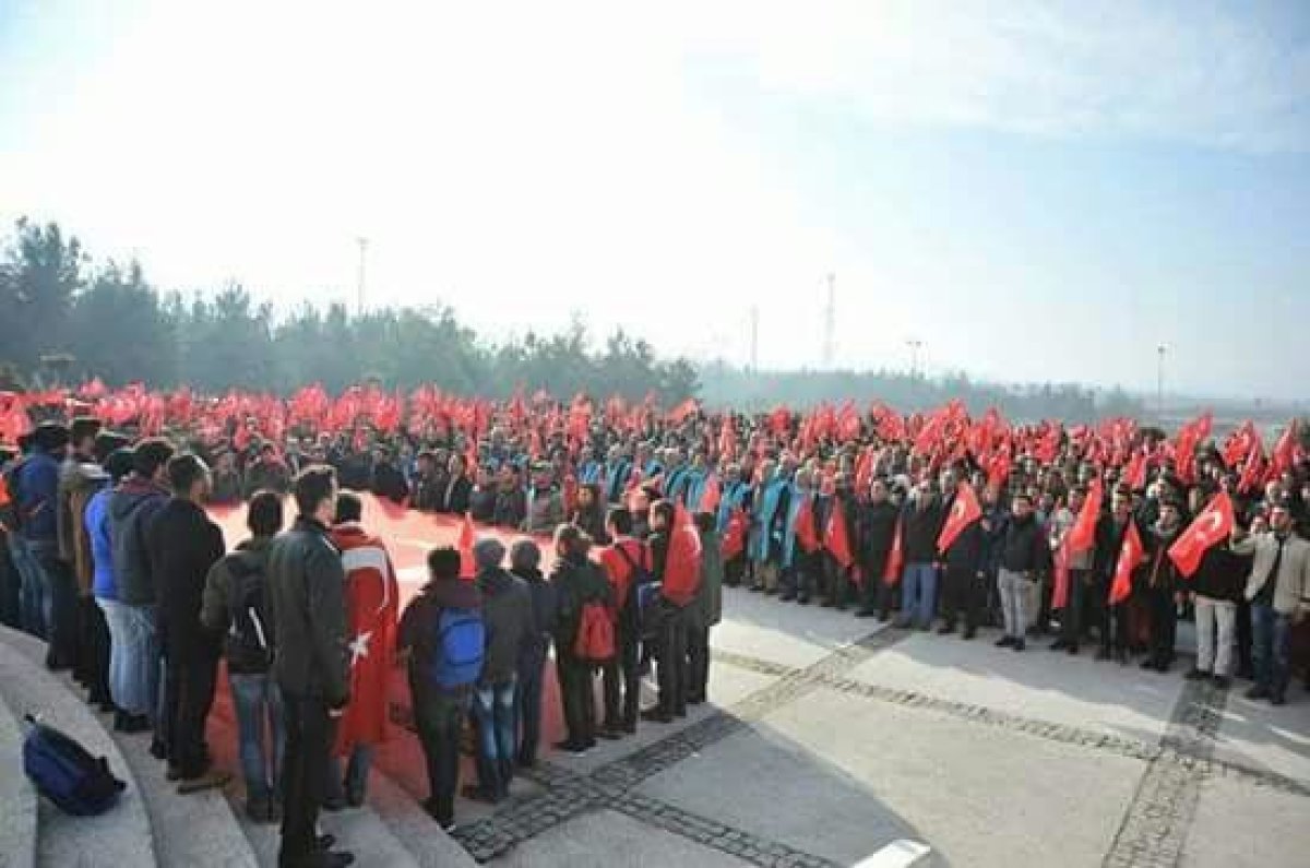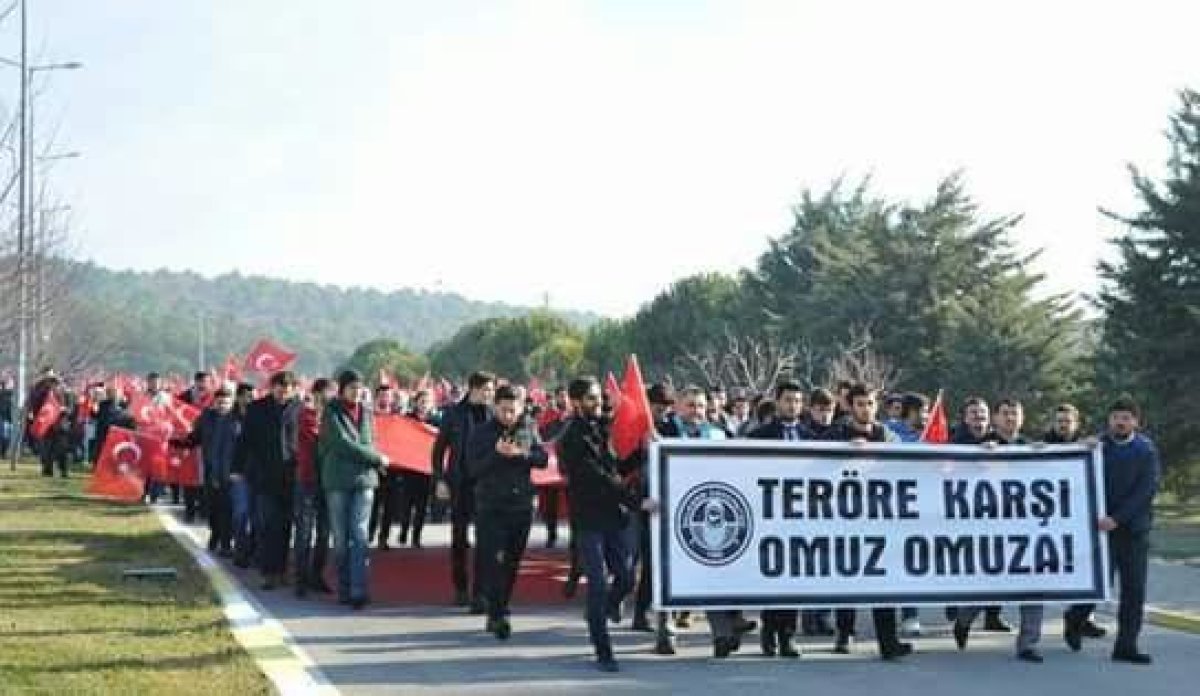 Terörü protesto eden, milli birlik ve beraberlik mesajı veren sloganların atıldığı yürüyüş, Çağış Yerleşkesinde Turizm Fakültesi önünden başladı. Rektörlük önünde sona eren yürüyüşün ardından, şehitler için saygı duruşunda bulunularak İstiklal Marşı okundu.