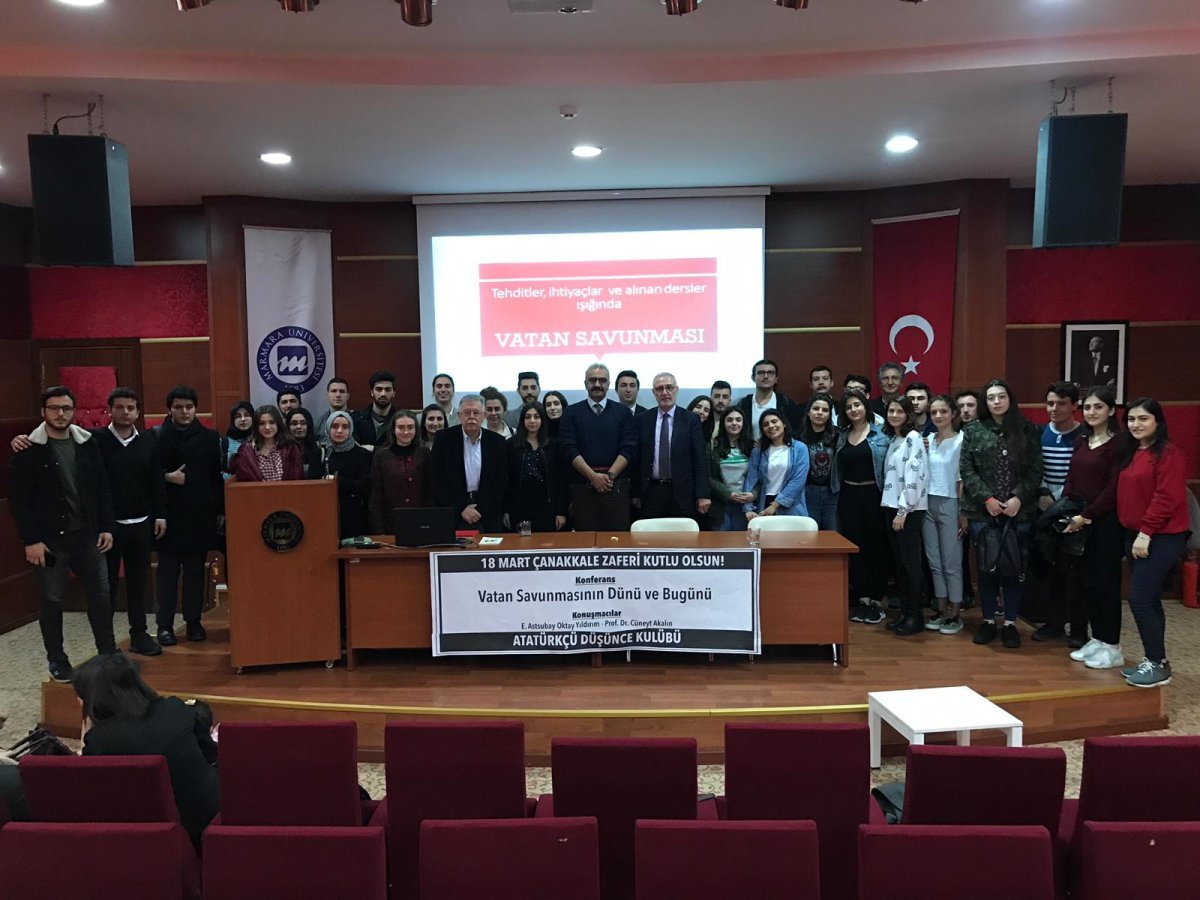 Marmara Üniversitesi Atatürkçü Düşünce Kulübü, yedi düveli dize getirdiğimiz 18 Mart Çanakkale Deniz Zaferi’ni Em. Ast. Oktay Yıldırım ve Prof. Dr. Cüneyt Akalın’ın katılımıyla “Vatan Savunmasının Dünü ve Bugünü” başlıklı konferansı düzenleyerek kutladı.