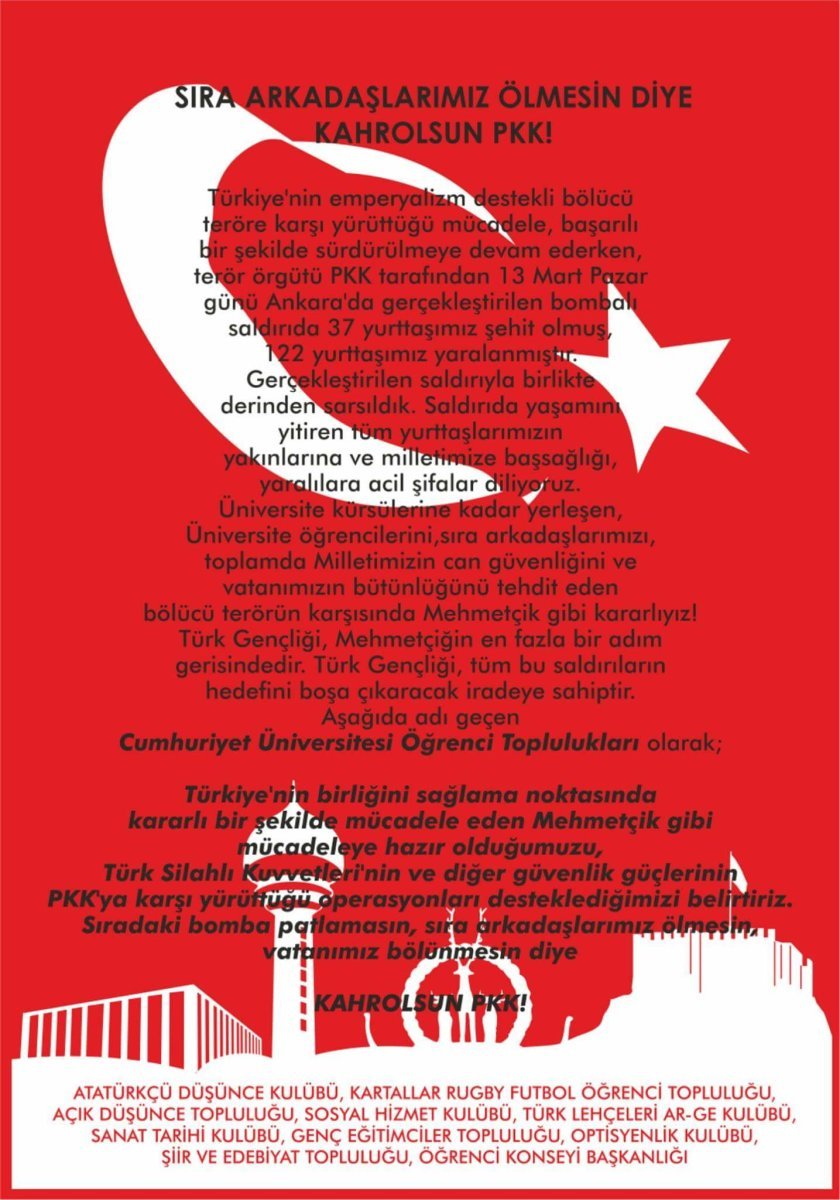 Cumhuriyet Üniversitesi Öğrenci Konsey Başkanlığının da içerisinde olduğu, Öğrenci toplulukları olarak PKK’ya karşı bildiri yayınladı.
