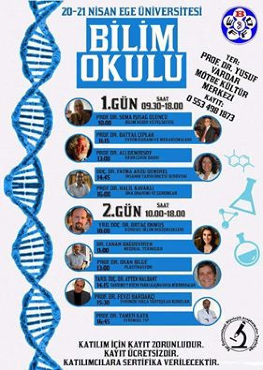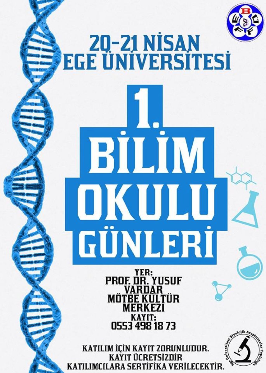 Ege Üniversitesi Biyolojik Araştırmalar Topluluğu (EGE BAT)’nun düzenlediği 1 Bölüm Okulu Günleri, çok sayıda değerli bilim insanlarını bir araya getiriyor. 20-21 Nisan 2016 tarihleri arasında Ege Üniversitesi MÖTBE’DE gerçekleşecek olan bilim şenliği için katılım zorunlu tutuluyor.