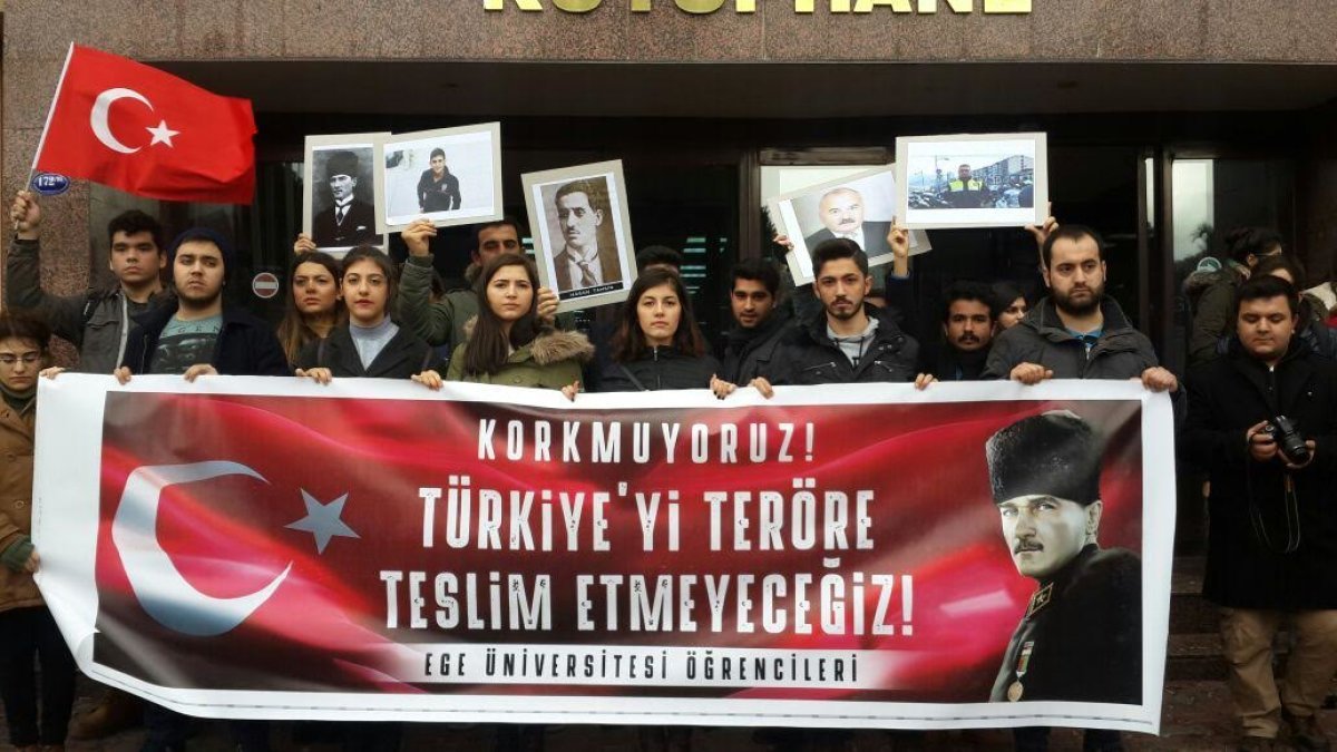 İzmir Bayraklı Adliyesi’nde meydana gelen hain terör saldırısına karşı, Ege Üniversitesi Öğrenci Konseyi’nin çağrısıyla Ege Üniversitesi Merkez Kütüphane önünde buluşan öğrenciler ve Türkiye Gençlik Birliği İzmir saygı duruşunun ardından okunan İstiklal Marşı’yla şehitlerimizi andı.