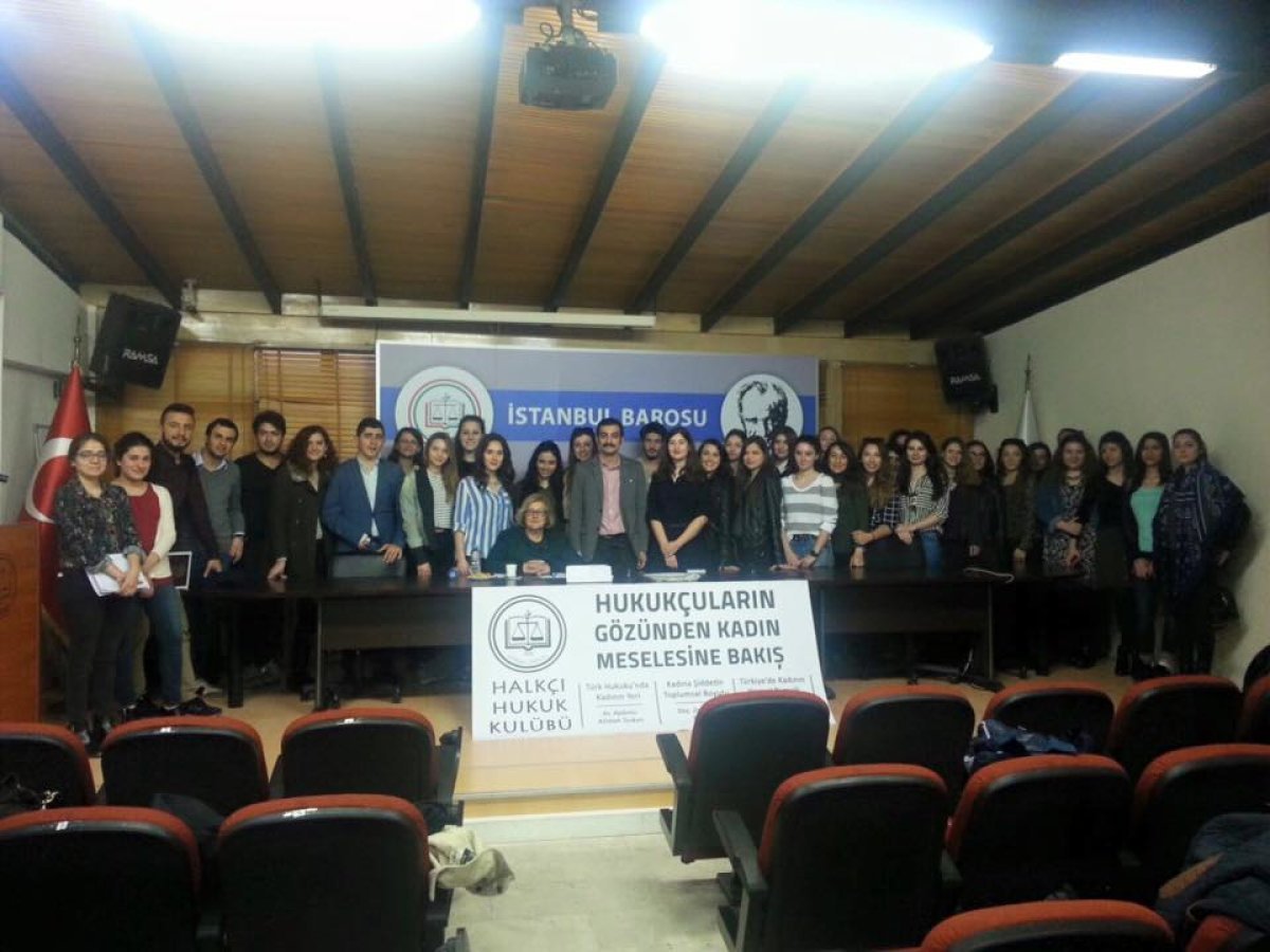9 Mart Çarşamba günü İstanbul Barosu Toplantı Salonu’nda İstanbul Barosu Kadın Hakları Merkezi ve İstanbul Üniversitesi Halkçı Hukuk Kulübü’nün “Hukukçuların Gözünden Kadın Meselesine Bakış” etkinliği gerçekleşti. Etkinliğe konuşmacı olarak İstanbul Üniversitesi Hukuk Fakültesi Öğretim Üyesi Doç. Dr. Sevtap Metin, 50. Hükümet Bakanı Av. Zehra Önay Alpago ve İstanbul Barosu Yönetim Kurulu Üyesi ve Kadın Hakları Merkezi Koordinatörü Av. Aydeniz Alisbah Tuskan katıldı.