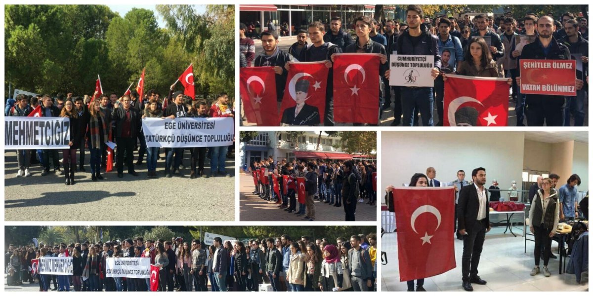 Ege Üniversitesi, Dokuz Eylül Üniversitesi ve Katip Çelebi Üniversitesi’nde teröre lanet eden öğrenciler, öğle aralarında anma gerçekleştirdi.Ege Üniversitesi Atatürkçü Düşünce Topluluğu, Dokuz Eylül Üniversitesi Cumhuriyetçi Düşünce Topluluğu ve TGB Katip Çelebi Üniversitesi Birim Örgütü’nün önderlik ettiği şehit anmalarında saygı duruşunda bulunulmasının ardından tek bir ağızdan İstiklal Marşı okundu. Türk bayrakları ve şehitlerin posterlerini ellerinde taşıyan öğrenciler, “Şehitler ölmez vatan bölünmez” ve “Hepimiz Mehmetçiğiz” sloganları attı.