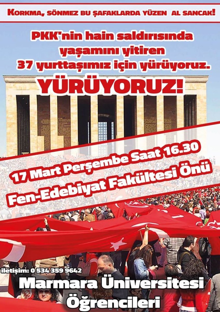 Marmara Ünivesitesi Göztepe Yerleşkesi’nde yapılacak yürüyüş, mehmetçik gibi hazır bekleyen Türkiye’deki tüm üniversitelilerin ortak sesi olacak.