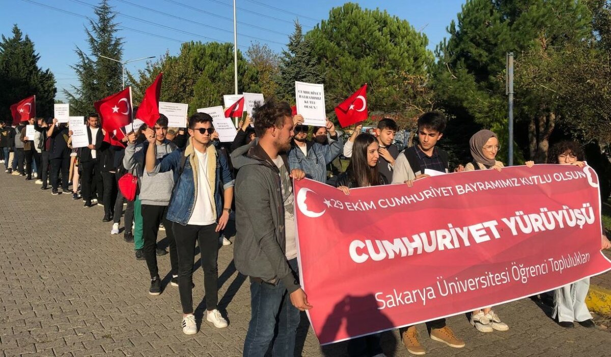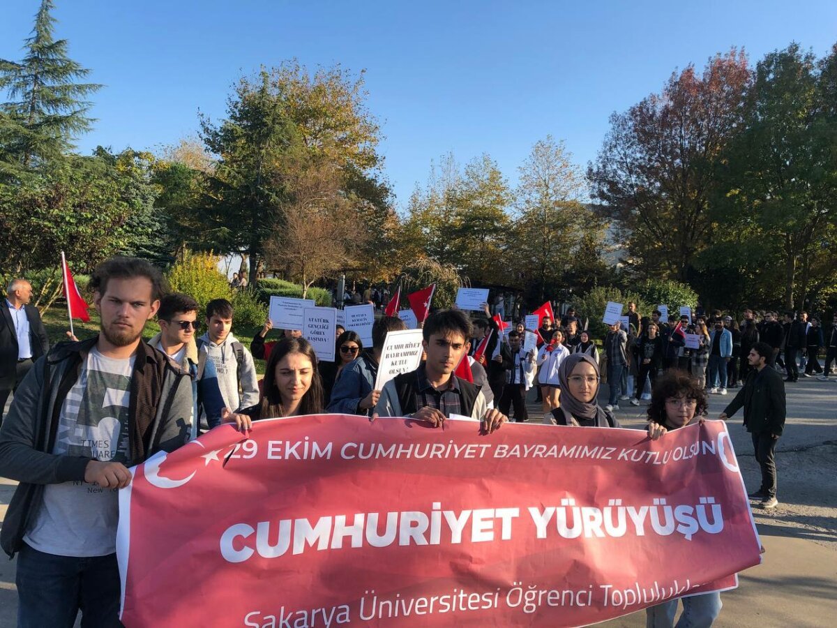 Sakarya Üniversitesi’nde 7 Öğrenci Topluluğu 29 Ekim Cumhuriyet Bayramını kutladı, topluluklar üniversitede yürüyüş yaptı.
