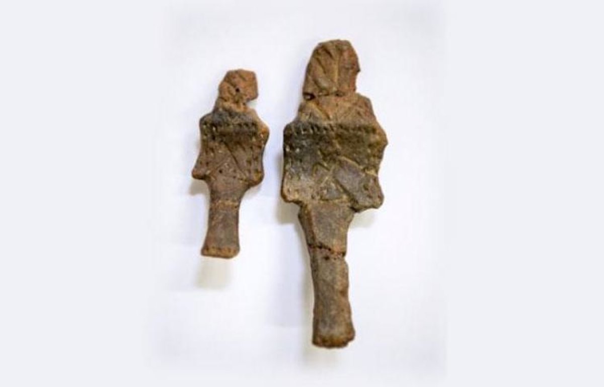 Biri büyük diğeri ise daha küçük boyutlu figürinler, mezarın içine ters şekilde konmuş ve ayakları uç uca gelecek şekilde özenli bir şekilde yerleştirilmişti. Figürinlerin ön yüzü stilize insan formunda olup, baş kısımları oval formlu, üzerinde kazınarak yapılmış iki yana açılan dal ya da yaprak betimlemesi olabilecek semboller bulunuyor.