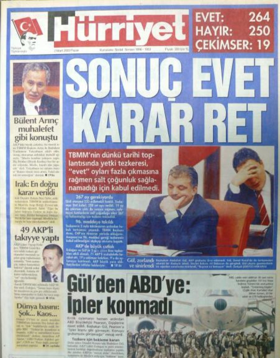 Tarihler 2003’ü gösterdiğinde ABD ve İngiltere önderliğinde oluşturulan Çokuluslu Koalisyon Kuvvetleri, Irak’a ‘demokrasi’ ve ‘özgürlük’ götürmek amacıyla kanlı postallarını hazırlamaya başladı. Irak’a, Türkiye üzerinden saldırmayı düşünen ABD, Türkiye’nin Güneydoğu’suna 65 bin asker konuşlandırmak, liman ve havaalanlarını kullanmak istedi. 1 Mart 2003 ABD Tezkeresi kısa yoldan Diyarbakır’dan Musul-Kerkük’e uzanan bir Kürdistan’ın ABD koruması altında çabucak inşasını hedefliyordu. Türkiye’nin bir anlamda işgali demek olan Tezkereye karşı harekete yurtseverler harekete geçti. Türkiye bu plana direndi… TBMM 1 Mart Tezkeresi ve planı çöpe attı… Daha tezkere çıkmadan İskenderun limanına gelen binlerce asker, tonlarca silah ve mühimmat yüklü gemiler geri dönmek zorunda kaldı.