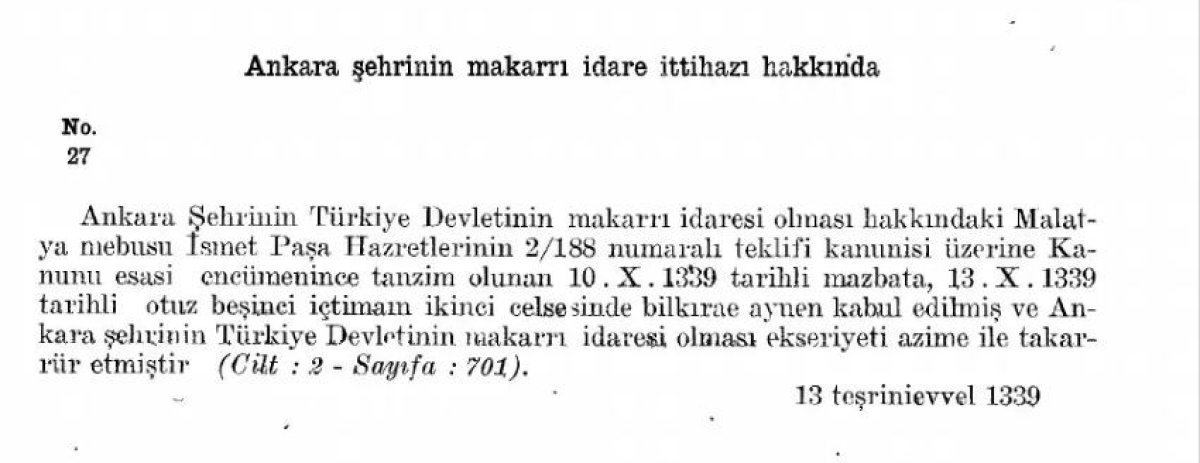 Tasarı, 13 Ekim 1923 yılında TBMM Genel Kurulu’nda görüşülerek TBMM’nin aldığı 27 numaralı karar olarak kabul ediliyor.