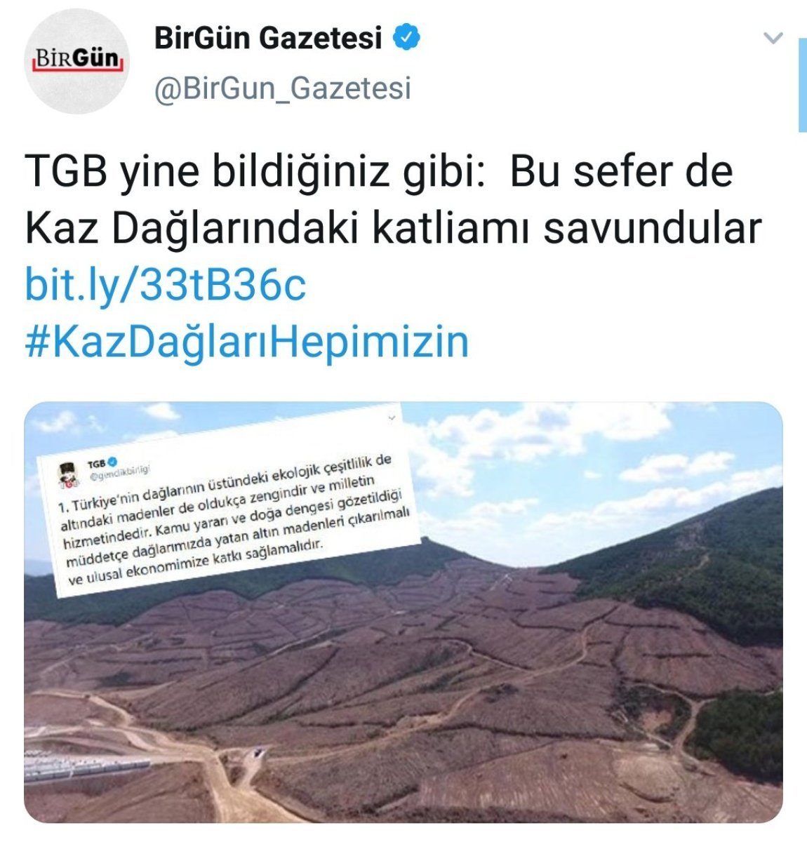 Türkiye Gençlik Birliği’ne Kaz Dağları açıklaması sonrası pek çok sözlü saldırı geldi. Bunların arasında “Yerin altı da vatan”, “Madenleri Kanadalı şirket çıkartacak, siz vatana sahip çıkmıyorsunuz”, “Logonuzdaki Atatürk’ü kaldırın” vb. yer alıyor. TGB açıklamasında 2 noktaya parmak basmıştı. Birincisi eylemi düzenleyen derneğin AB tarafından fonlanması ve eylemlerin kamuoyunu yanıltması. İkincisi ise madenlerin tamamen devlet eliyle işletilmesi gerektiği, yani millileştirilmesi. Açıklamanın ikinci kısmına odaklanmayanlar TGB’nin ağaç katliamını desteklediğini söylüyorlar (ki bunlar ilk kısımdaki AB faktörünü de es geçtiklerini söylüyorlar). TGB’nin yaptığı açıklamada verilen mesaj açık ve nettir. Ancak biz yine bu açıklamayı destekleyecek bir örnek verelim.