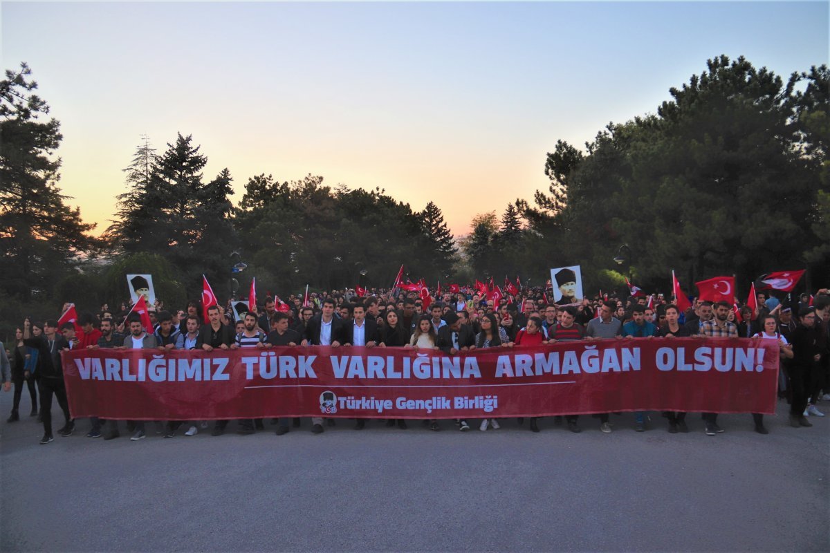Yürüyüşümüz, Birinci Meclis önünde İstiklal Marşı’nın okunmasıyla başladı. Vatan Partisi ve Cumhuriyet Kadınları Derneği’nin (CKD) de destek verdiği yürüyüşte Ankara Ulus Meydanını, Türk Bayraklarıyla kırmızıya boyadık. 20 bin genç, “Ne mutlu Türküm diyene” ve “Mustafa Kemal’in askerleriyiz” sloganlarıyla Anıtkabir’e yürüdük.