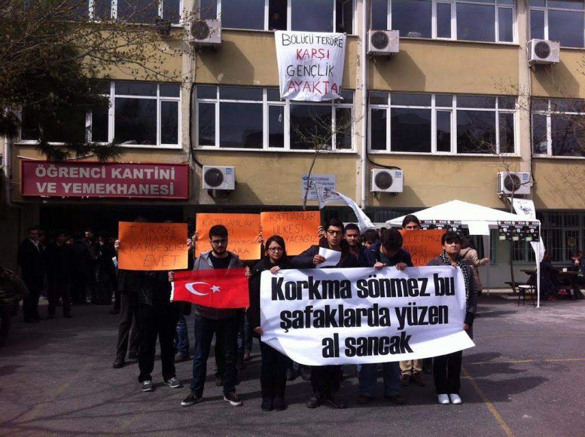 Ankara’da gerçekleşen hain terör saldırısından sonra tüm yurtta olduğu gibi üniversitelerde de tepkiler büyümeye devam ediyor. Birçok üniversitede, terör saldırılarında yitirilen yurttaşlarımız için saygı duruşunda bulunuldu. İstanbul’daki 27 öğrenci topluluğunun imzaladığı “Bölücü Teröre Karşı Gençlik Ayakta” bildirisini, Çapa Tıp Fakültesi bahçesinde gerçekleştirilen saygı duruşu ardından topluluklar adına İstanbul Tıp Fakültesi Atatürkçü Düşünce Kulübü Başkanı Eren Öztürk açıkladı. Ankara patlamasının baş sorumlusu PKK terör örgütünün lanetlendiği eylemde, En büyük vicdan ayaktadır; Türk milletinin ve gençliğinin vicdanı teröre son vermesi için Mehmetçik’le omuz omuzadır. Üniversite toplulukları olarak kalbimiz Mehmetçikle ve bölücülüğe karşı mücadele eden milletimizle birlikte çarpıyor. Tüm üniversite gençliğini bu çağrıya destek vermeye çağırıyoruz. Üniversitelerde bölücü terör tehdidine geçit vermeyelim! vurgularında bulunuldu.