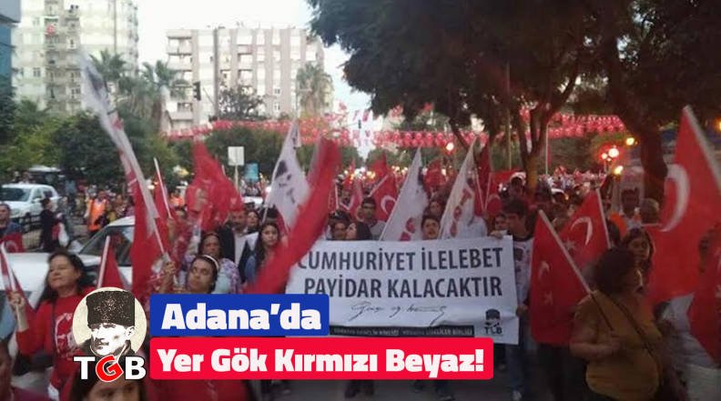 Adana 29 Ekim Cumhuriyet Bayramı’nı büyük bir coşku ile kutladı.Atatürk Parkı’ndan Uğur Mumcu Meydan ‘ına gerçekleşen yürüyüşte hep bir ağızdan ‘Türkiye laikliktir, laik kalacak ‘, ‘Mustafa Kemal’in Askerleriyiz’ sloganları atılarak büyük bir coşku ile gerçekleştirildi.tgb.gen.tr