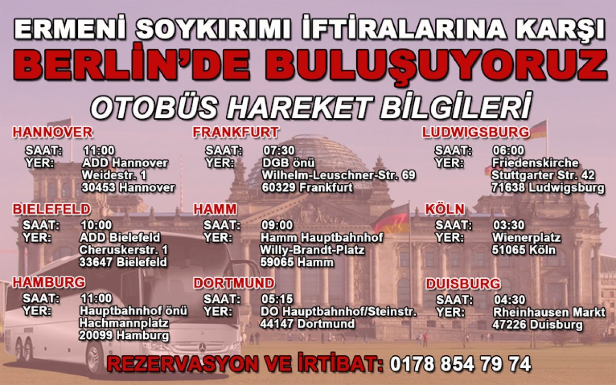 Türkiye Gençlik Birliği’nin de aralarında bulunduğu Almanya’da faaliyet gösteren Türk kuruluşlarının Alman Meclisi’nin Ermeni Soykırımı İftiralarına karşı düzenleyeceği büyük yürüyüşe sayılı saatler kala detaylar da netleşiyor. Bir yanda Berlin’deki hazırlıklar devam ederken, Almanya çapında Berlin’e akacak yurtseverelerin hareket saatleri de duyurulmaya başlandı. İllere göre otobüs hareket saatleri ve yerleri şu şekilde