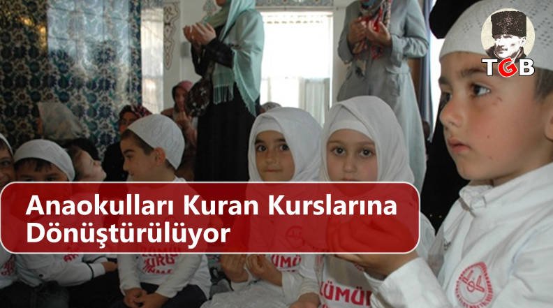 Kuran kurslarına yaş sınırının kalkması, okullarda din içerikli derslerin artmasının ardından şimdi de anasınıfları Kuran kurslarına dönüştürülüyor.Sakarya’da “Değerler Eğitimi” kapsamında; İl Milli Eğitim Müdürlüğü ve İl Müftülüğü işbirliğinde anasınıfı öğrencilerine yönelik olarak Kur’an eğitimleri verilecek. Kur’an eğitimi ile ilgili işbirliği protokolü İl Milli Eğitim Müdürü Mevlüt Kuntoğlu ile İl Müftüsü İlyas Serenli arasında imzalandı.Sakarya’daki özel anaokulları ve bünyesinde anasınıfı olan devlet okullarında uygulanacak Kur’an eğitimiyle, 4-6 yaş arası çocuklar hedef alınıyor. Anaokullarına yönelik projeyi değerlendiren İl Milli Eğitim Müdürü Kuntoğlu, amaçlarının 4-6 yaş grubundaki öğrencilerin Kur’an eğitimine küçük yaşlardan itibaren başlamalarını sağlamak olduğunu belirtti.Diyanet İşleri Başkanlığı’nın Nisan 2012’de düzenlediği Kur’an Kursları Yönetmeliği’ne göre kursların açılması ve denetiminde Milli Eğitim Bakanlığı devre dışı bırakılmış ve 12 yaş sınırı kaldırılmıştı. Diyanet’in teklifi üzerine mülki idare amirinin izniyle açılan kurslarda siyasi nitelikteki etkinlikler de serbest bırakılmıştı. Kur’an Kursunda yaş sınırının kaldırılmasının ardından Diyanet İşleri Başkanlığı, “Kuran Kursları Okul Öncesi Din Eğitimi Projesi” hazırlamıştı. Proje kapsamında, anneleri Kur’an kursuna giden 4- 6 yaş grubundaki çocuklar için eğitim sınıfları açılmış ve pilot olarak seçilen illerde sınıflar açılmıştı. (Aydınlık)tgb.gen.tr