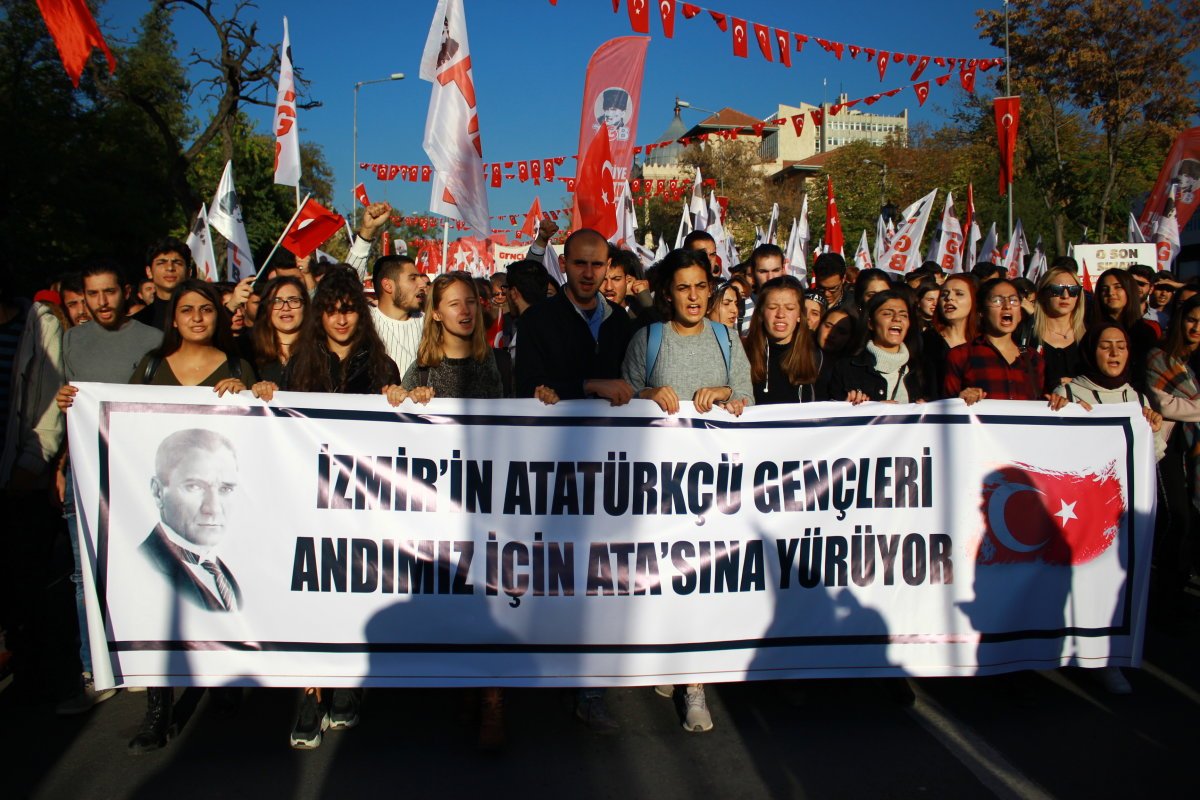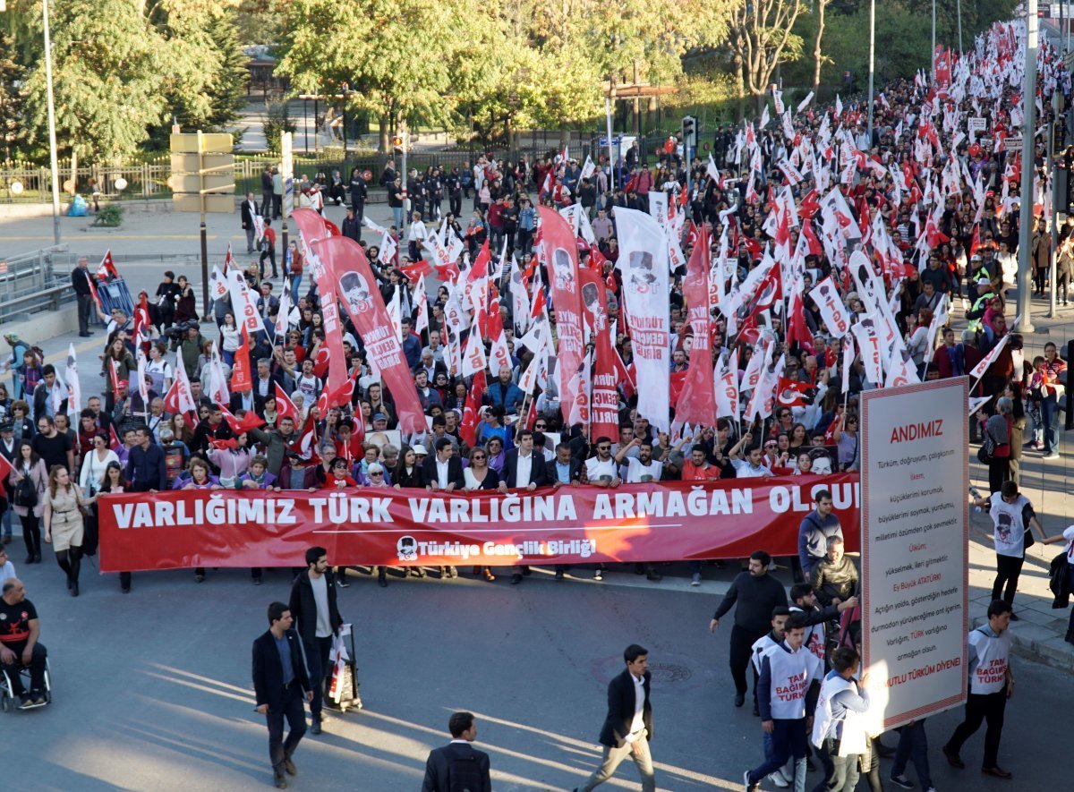 Yürüyüşümüz, Birinci Meclis önünde İstiklal Marşı’nın okunmasıyla başladı. Vatan Partisi ve Cumhuriyet Kadınları Derneği’nin (CKD) de destek verdiği yürüyüşte Ankara Ulus Meydanını, Türk Bayraklarıyla kırmızıya boyadık. 20 bin genç, “Ne mutlu Türküm diyene” ve “Mustafa Kemal’in askerleriyiz” sloganlarıyla Anıtkabir’e yürüdük.