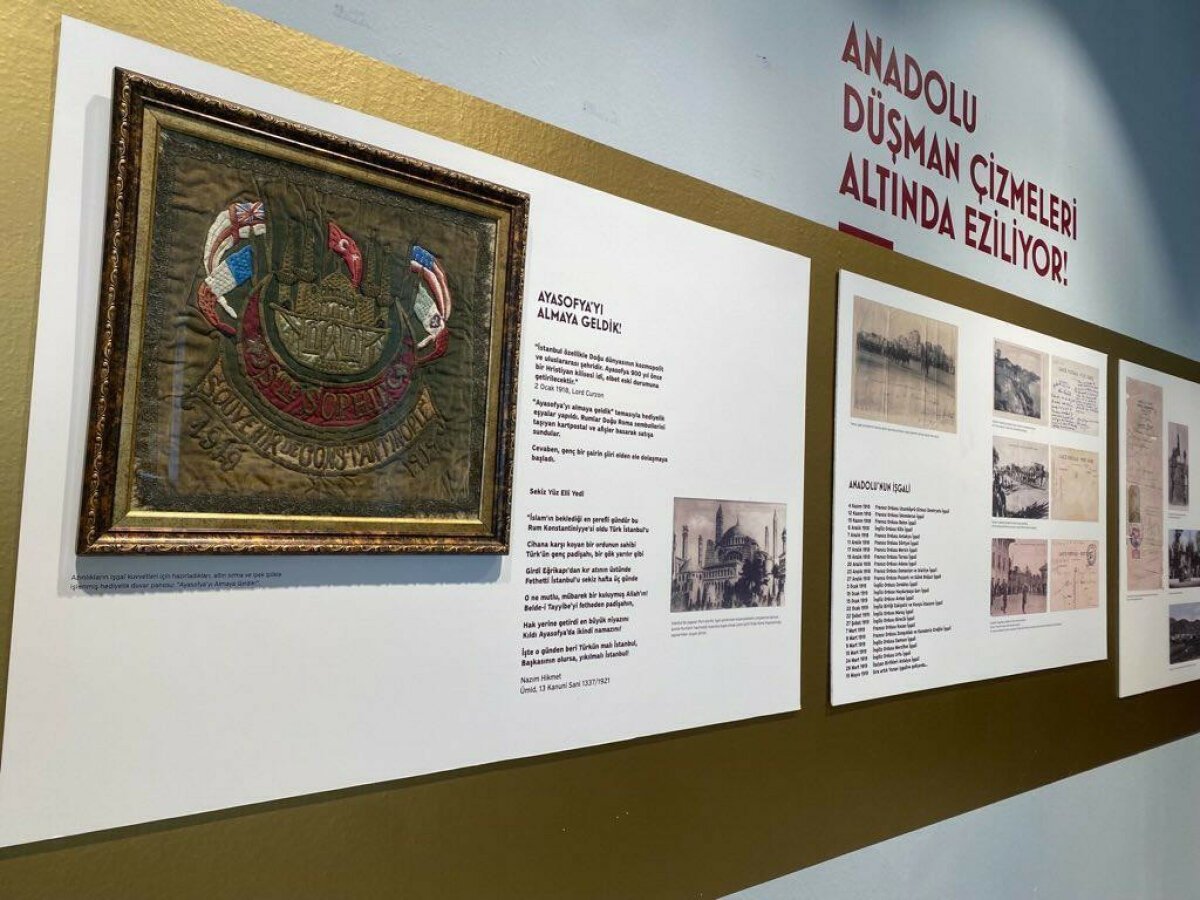 Koleksiyoncular Derneği’nin başını çektiği bu seçkin sergiyi bizzat Korkut Erkan ile gezme şansına eriştik. Anlatmakla bitirilemeyecek eserler arasında aklımda en çok işgalcilerin Mondros Anlaşması’nın hemen ardından kapıldıkları coşkuyla bastırdığı altın sırmalı ipek işlemeli kumaş hatıra kaldı. İngiltere, Fransa, ABD ve İtalya bayraklarının Türk bayrağının etrafını sardığı bu nakışta “Konstantinapol Hatırası” notuyla “Ayasofya’yı almaya geldik.” yazıyordu.