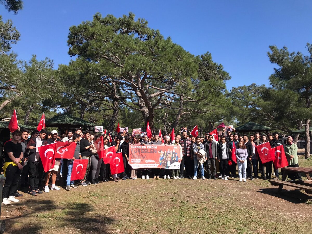 Akdeniz Üniversite öğrencileri Yükselen Kadın Yükselen Türkiye Mitinginin pankartı ve Türk Bayraklarıyla Türk kadının yanında olduklarını gösterdi.