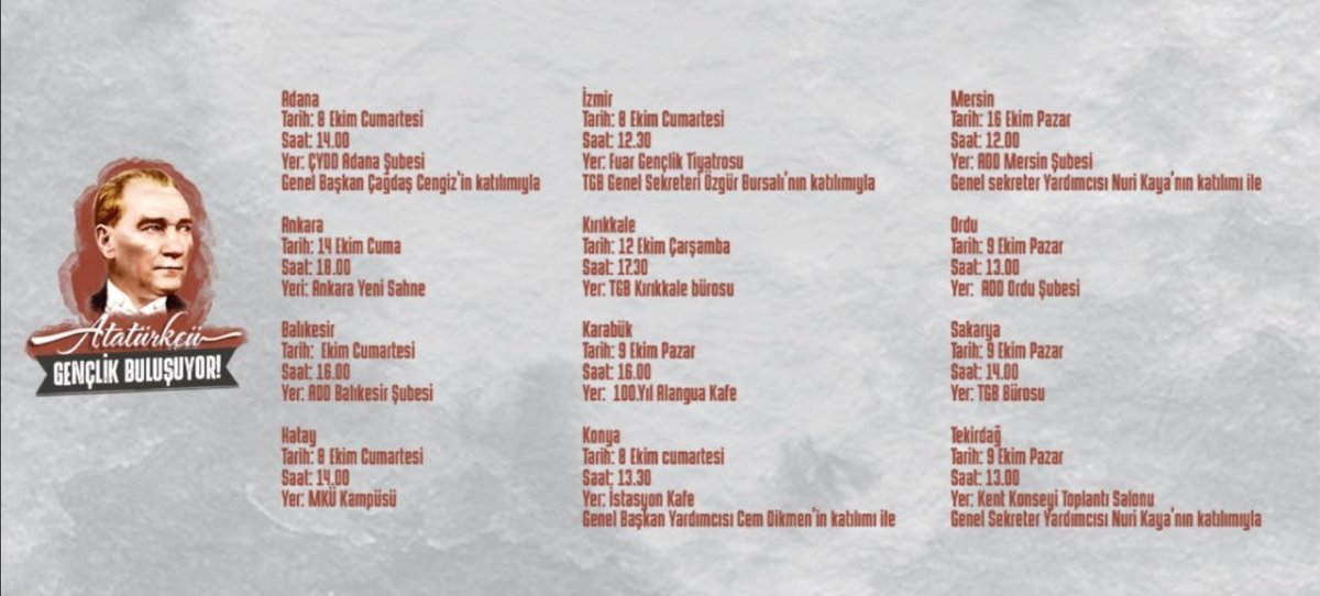 Üniversitelerde “Atatürkçü Gençliğe Katıl” çağrısıyla çalışmalar yaparak seneye hızlı ve yoğun bir şekilde giren TGB, yurt genelinde düzenlenecek genel üye toplantılarıyla Atatürkçü Gençliği bir araya getiriyor.