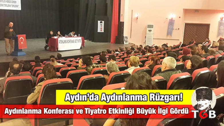 TGB Aydın 26-27 Aralık tarihlerinde Ankara Üniversitesi Tıp Fakültesi Morfoloji Binası Dr. Abdulkadir Noyan Konferans Salonu’nda yapılacak olan “Aydınlanma Sempozyumu” öncesi Aydın’da TGB Genel Başkanı Yardımcısı Elif İlhamoğlu, Adnan Menderes Üniversitesi Eğitim Fakültesi öğretim üyesi Prof.Dr Ruhi Sarpkaya ve İstanbul Devlet Tiyotro oyuncusu Deniz Hasbioğlu’nun katılımıyla ”Aydınlanma Konferansı ve Tiyatrosu” isimli etkinliği gerçekleştirdi.Etkinlğin açılışını TGB Aydın İl Başkanı Uğur Aykaç yaptı. Aykaç açılış konuşmasında gericiliğe karşı aydınlanma şehidimiz Kubilay gibi hazır olduklarını belirtti.Konferans Prof.Dr. Ruhi Sarpkaya’nın ”Eğitimin Aydınlanmaya Katkısı”, TGB Genel Başkan Yardımcısı Elif İlhamoğlu’nun ”Aydınlanmada Kadının Yeri” ve İstanbul Devlet Tiyatro oyuncusu Deniz Hasbioğlu’nun ”Aydınlanmanın Tiyatroya Katkısı” konularıyla ilgili konuşmalarıyla devam etti. Konuşmaların ardından Anton Çehov’un ”Biçare Kadın” isimli tiyatrosunun sahnelenmesinin ardından etkinlik son buldu.tgb.gen.tr