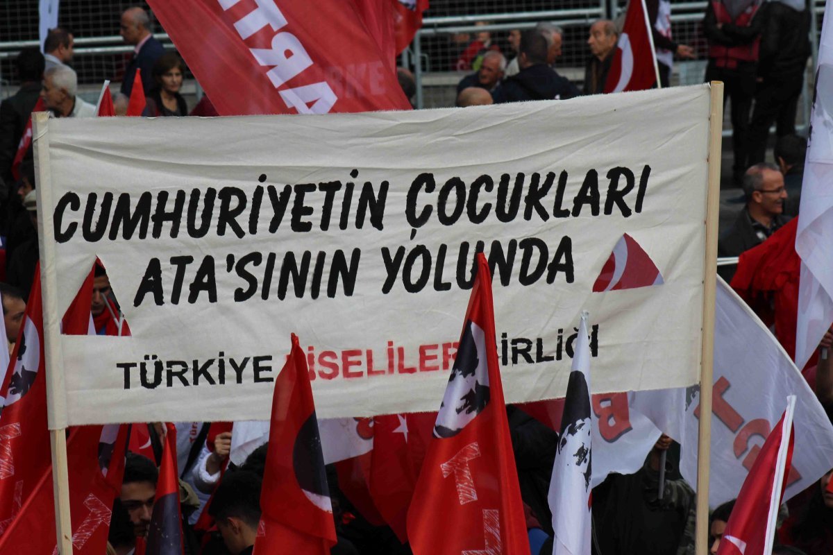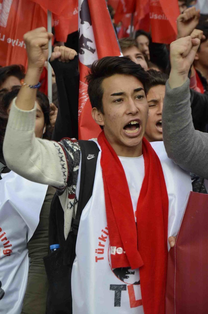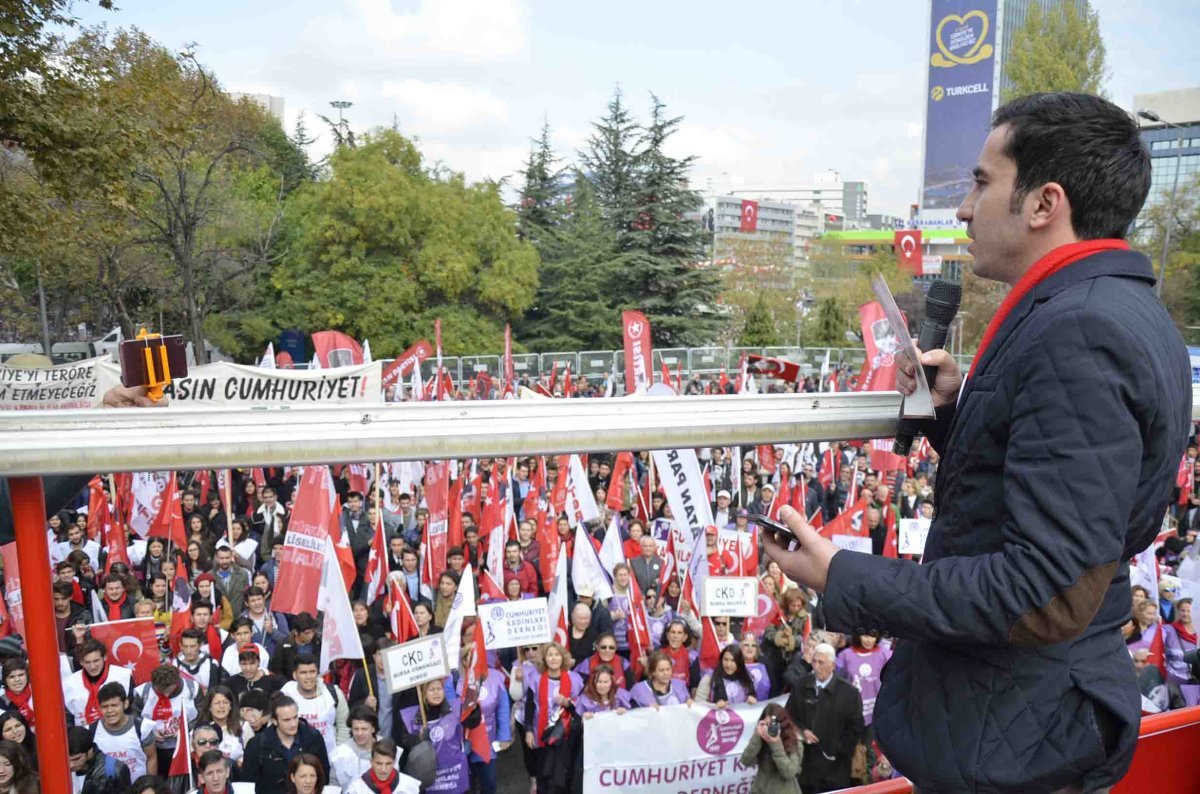 Güvenpark’taki mitingin açılış konuşmasını TLB Genel Başkanı Bora Çelik yaptı. Çelik; ‘’Cumhuriyet bizim tutkumuzdur, en büyük sevdamızdır. Geçen sene Talim Terbiye Kurulu bir taslak yayınladı. Atatürk’ü tarih kitaplarından çıkarabildiler mi? Şimdi proje okullarıyla cumhuriyetin okullarını elimizden almaya çalışıyorlar. Yine başaramayacaklar. Türkiye şu an içte ve dışta büyük bir savaşın içinde. Abdülhamit’e sığınarak, Lozan’a saldırarak zafere ulaşılamaz. Atatürk’e sarılarak kazanacağız. Başkanlığa asla geçit vermeyeceğiz, cumhuriyete sarılacağız.’’ dedi.