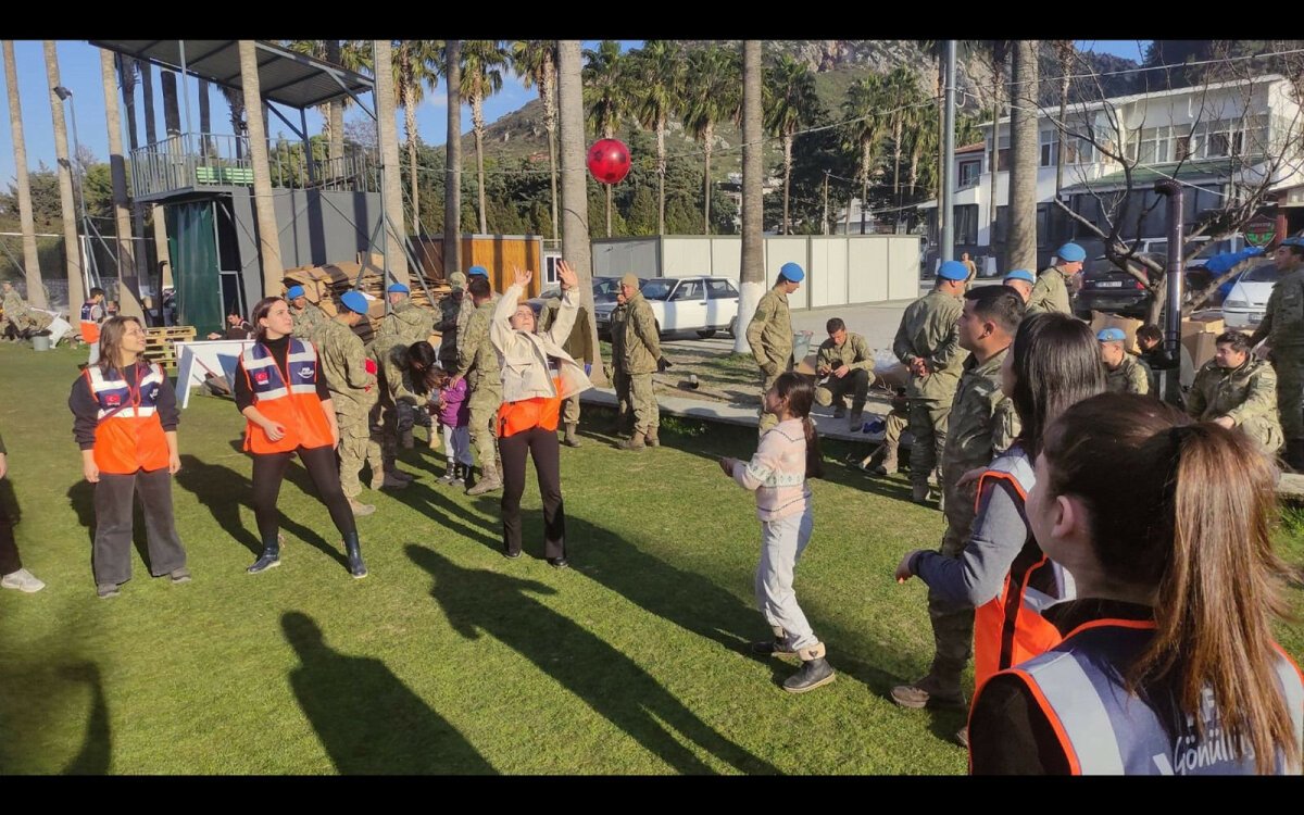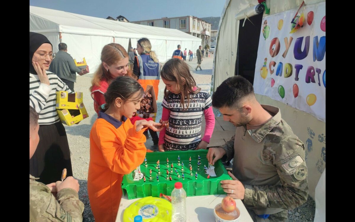 Hem çalışma hem oyun bir arada. Çalışmaların arasında Mehmetçik de çadır kentlerdeki gençlerle vakit geçiriyor. Depremin acıları el birliğiyle, umutla sevince dönüşüyor.