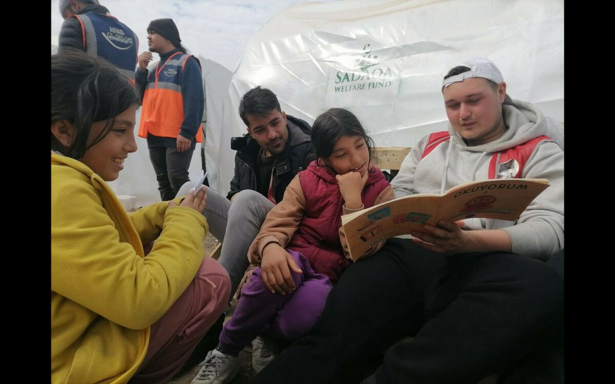 Çadır kentte özellikle çocuklar depremin yaralarını sarmak için gayretli. İki küçük kardeşimiz, getirdikleri kitapları TGB’li büyüklerinden okumalarını istiyorlar.