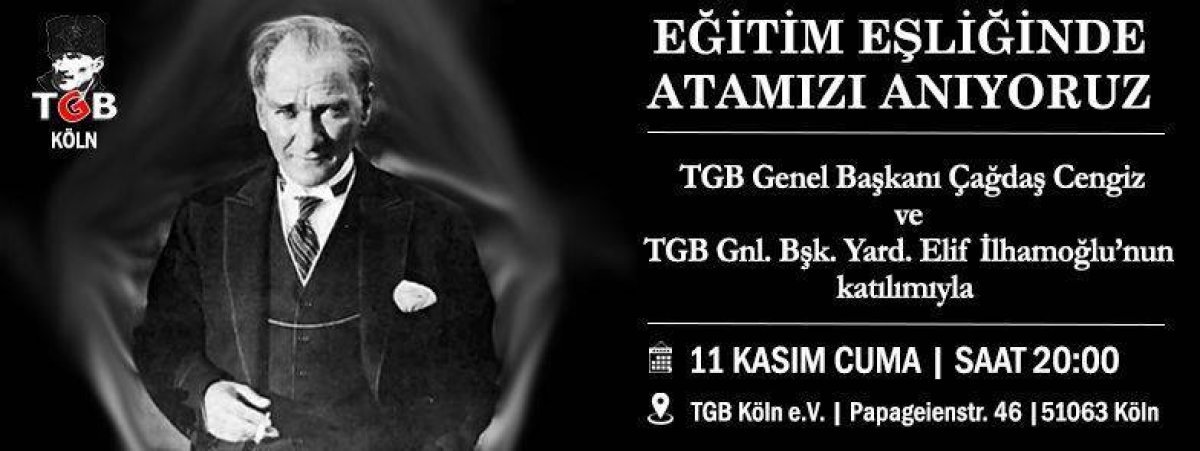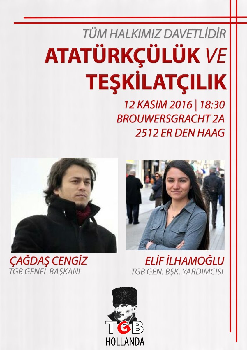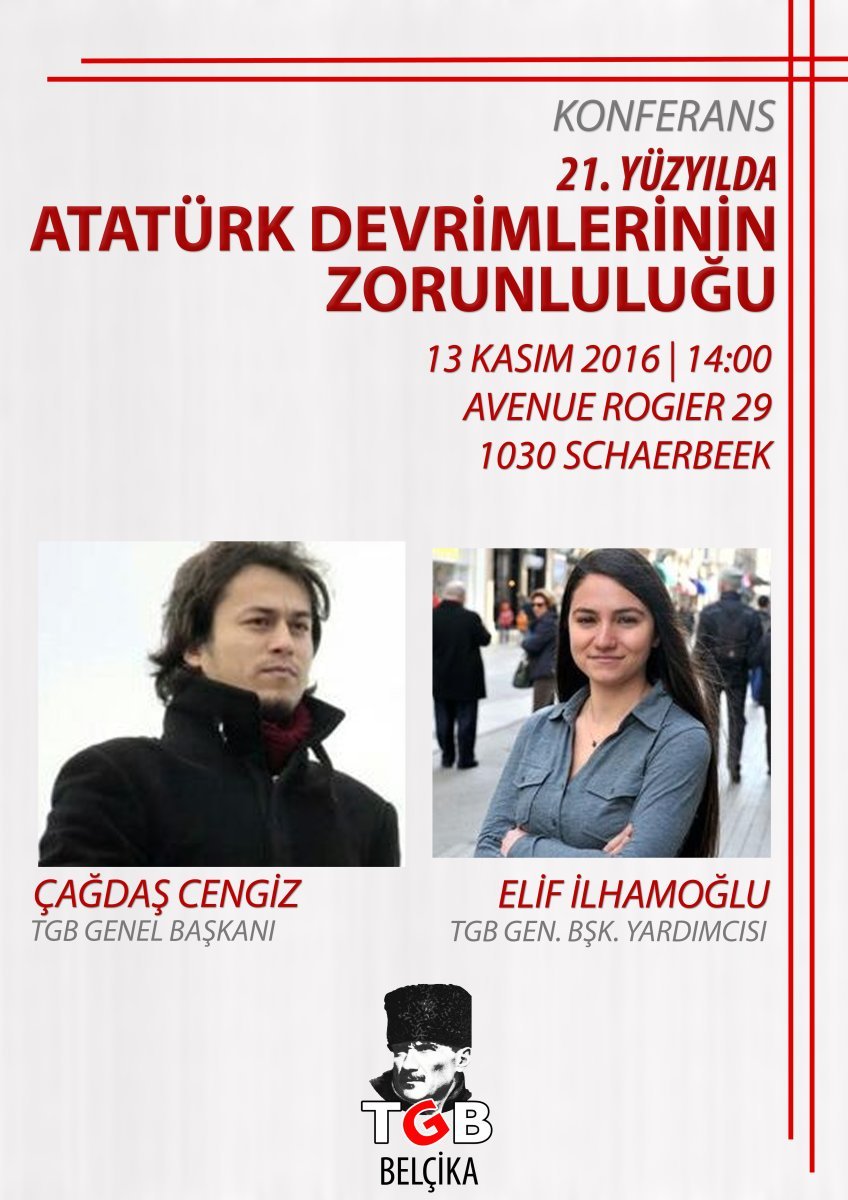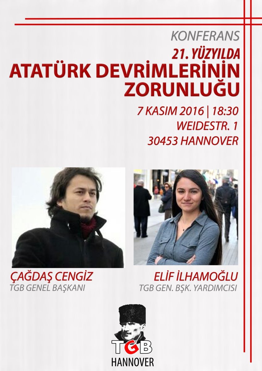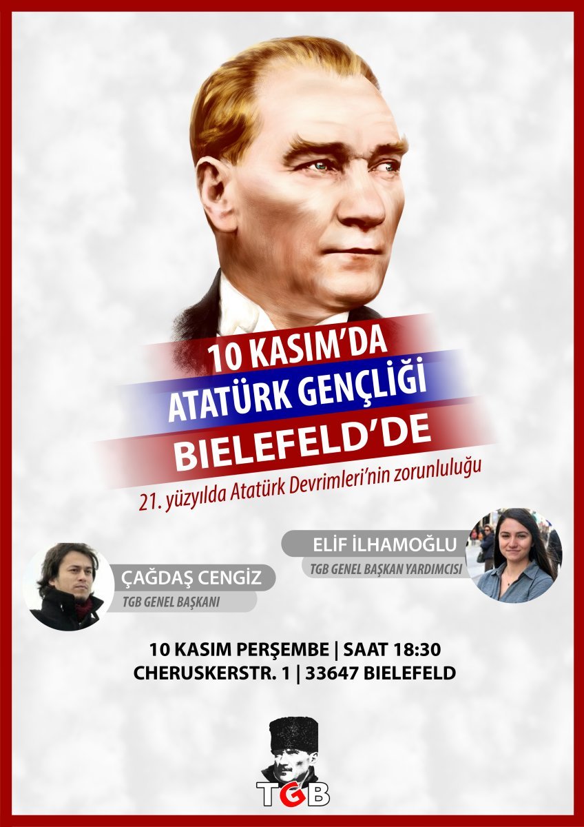 14 Kasım’a kadar bir dizi ziyaretler gerçekleştirecek olan Çağdaş Cengiz ve Elif İlhamoğlu, Almanya, Hollanda ve Belçika’da “21. yüzyılda Atatürk Devrimlerinin Zorunluluğu1” konulu konferanslarda konuşacaklar. Cumhuriyetimizin kurucusu Mustafa Kemal Atatürk’ün ebediyete intikal ettiği 10 Kasım’da Bielefeld’de olacak Genel Başkanımız Çağdaş Cengiz ve Genel Başkan Yardımcımız Elif İlhamoğlu’nun programları şu şekilde: