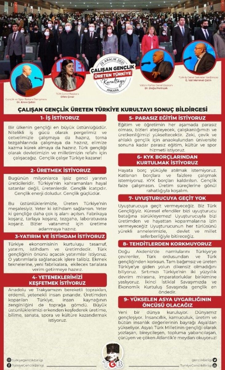 Buradan Özgür Özel’i uyarıyoruz! Türk gençliği sizin bölücülüğe ve gericiliğe alan açan faaliyetlerinize izin vermeyecek! Emperyalizmin planı olan “Türk gençliğini milli kimliğinden koparma” planı çoktan suya batmıştır. Türk gençliği sizler gibi ülkesinden kaçmak istemiyor. Ülkesinde üretmek, ülkesi için çalışmak istiyor.
