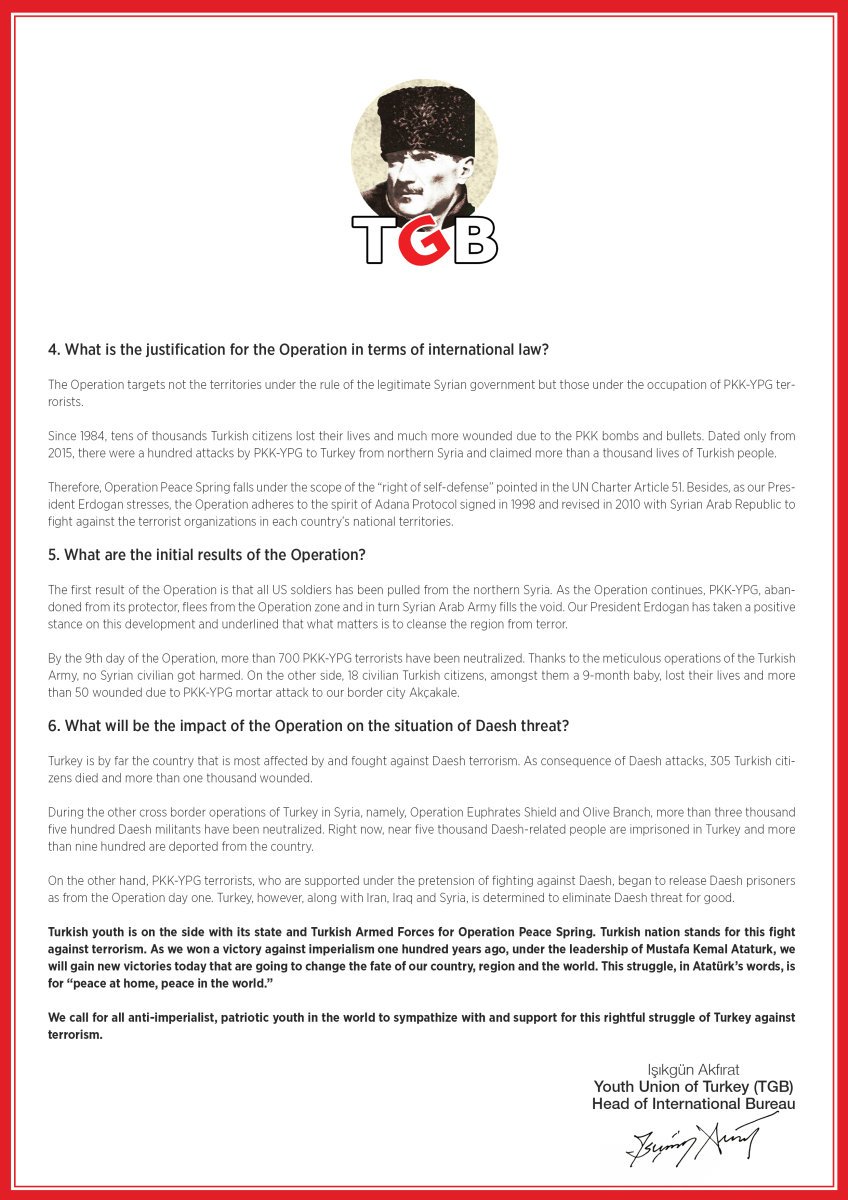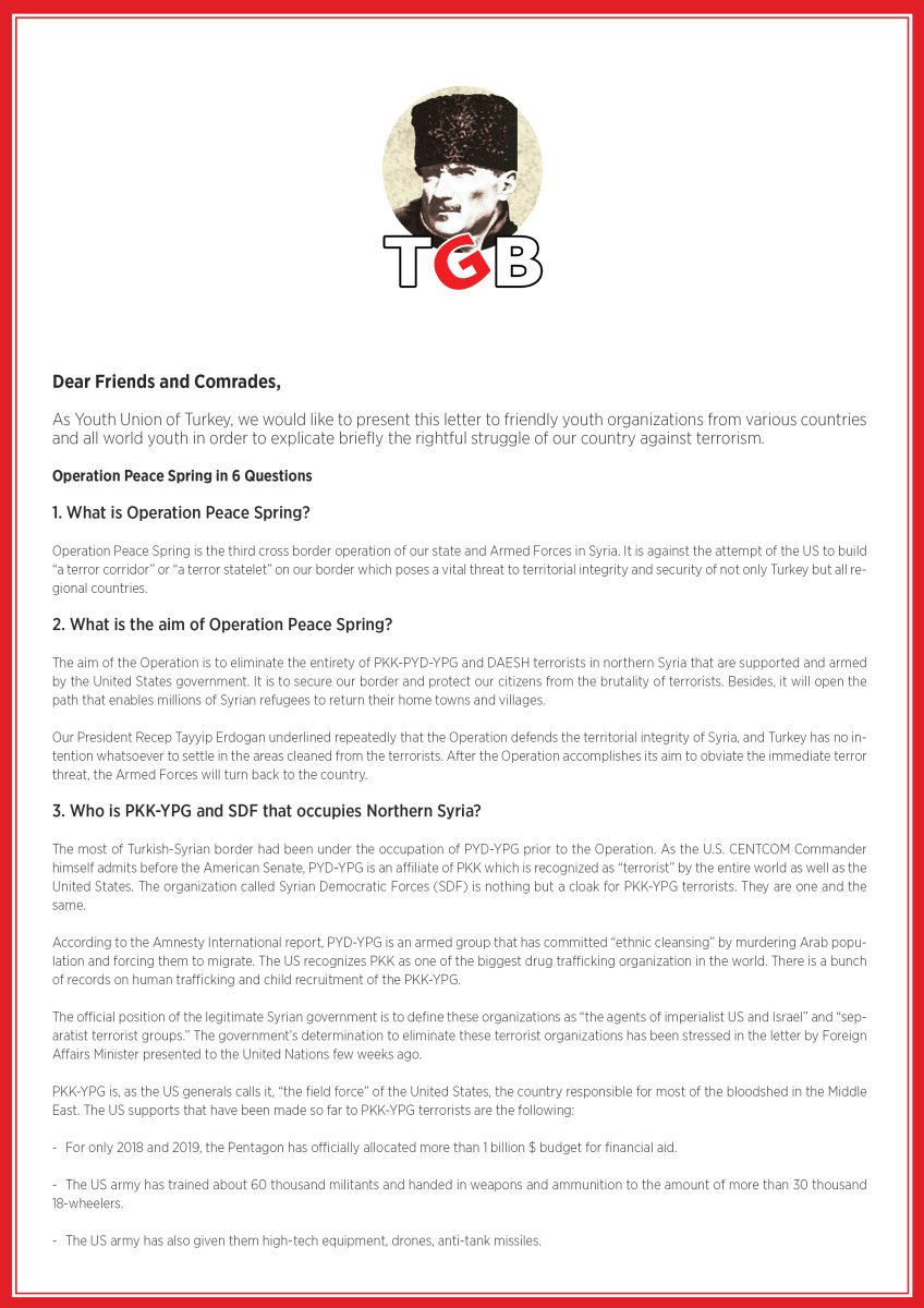 TGB Uluslararası İlişkiler Bürosu Başkanımız Işıkgün Akfırat’ın imzasıyla gönderdiğimiz mektupta 6 soruda Barış Pınarı Operasyonu’nun gerçekleri anlatıldı. PKK-YPG’nin karanlık terör sicili, emperyalist ABD’yle piyonluk ilişkisi, Operasyon’un amacı ve uluslararası meşruiyeti, Türkiye’nin IŞİD’le mücadele kararlılığı ele alındı.