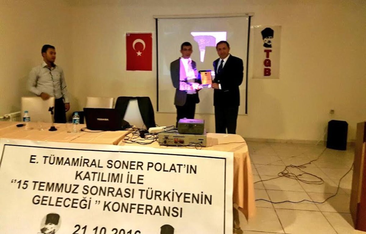 Konuşmalarının ardından Muğla İl Başkanı Doğan Özkan Konferansın bitiminde E.Tümamiral Soner Polat’a TGB Muğla adına teşekkürlerini iletip, plaket taktim etti.