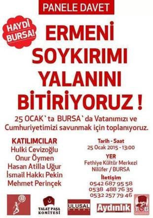 Bursa’da TGB, CKD, Talat Paşa Komitesi, Ulusal Kanal, Aydınlık Gazetesi Ermeni Soykırımı Yalanını Bitiriyoruz isimli panel düzenliyor. Saat 13.00’de başlayacak olan panele Onur Öymen, İsmail Hakkı Pekin, Hasan Atilla Uğur ve Mehmet Perinçek panelist olarak katılacaklar. Bursa Fethiye Kültür Merkezi’nde yapılacak paneli saat 13.15 itibariyle Ulusal Kanal canlı olarak yayınlayacak.