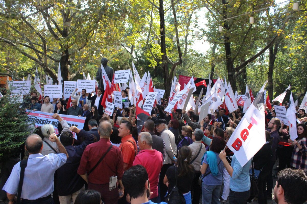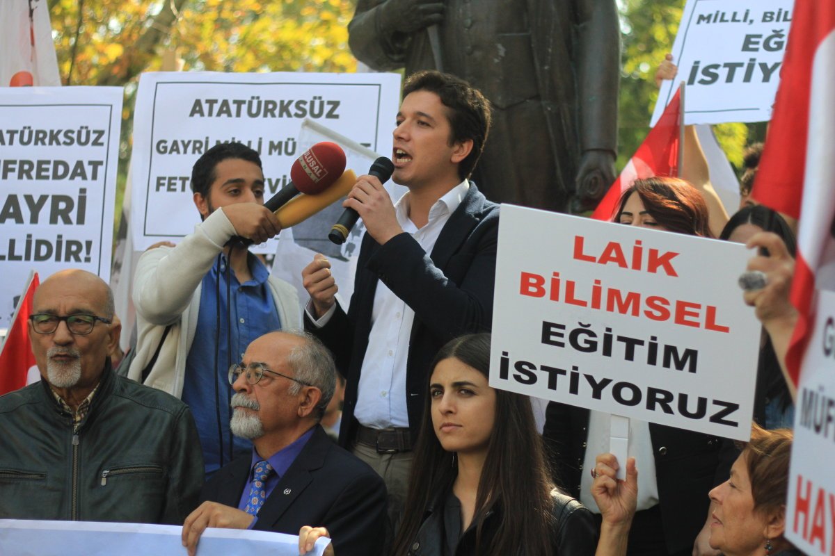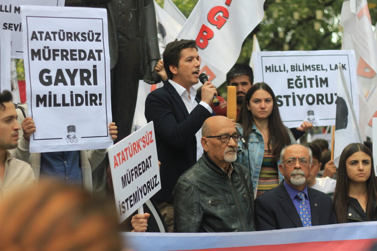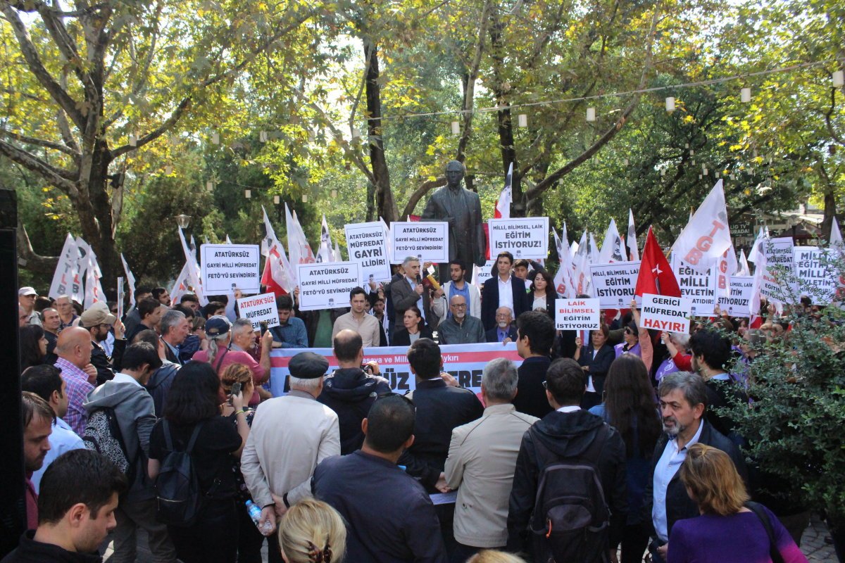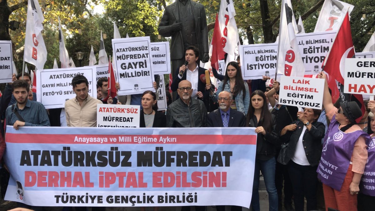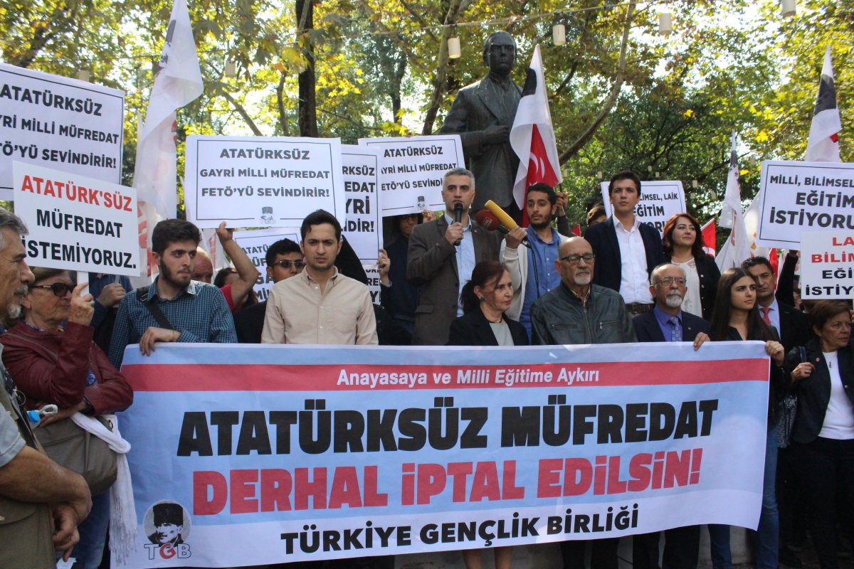 Bugün buradatoplumumuzda büyük tartışmalara yol açan, her kesimden tepkiler toplayan, Talim ve Terbiye kurulunun hazırladığı müfredat değişikliğiyle ilgili toplanmış bulunuyoruz. Zorlu savaş koşullarının ardından, Türk Milleti’ni bağımsız, vatansever ve çağdaş bir toplum haline getiren, milli eğitim sistemimizi savunmak üzere toplanmış bulunuyoruz. Türkiye’nin ilerici, vatansever kuvvetleri olarak yeni müfredatın derhal geri çekilmesini talep ediyoruz. Çünkü bu müfredatın içinde Atatürk yok. Bu müfredatın içinde laik devlet yapısına saldırı var. Bu müfredatın içinde bilim yok, milli eğitim ideali yok, vatanseverlik yok. Bu müfredat, bilime ve anayasaya aykırı.