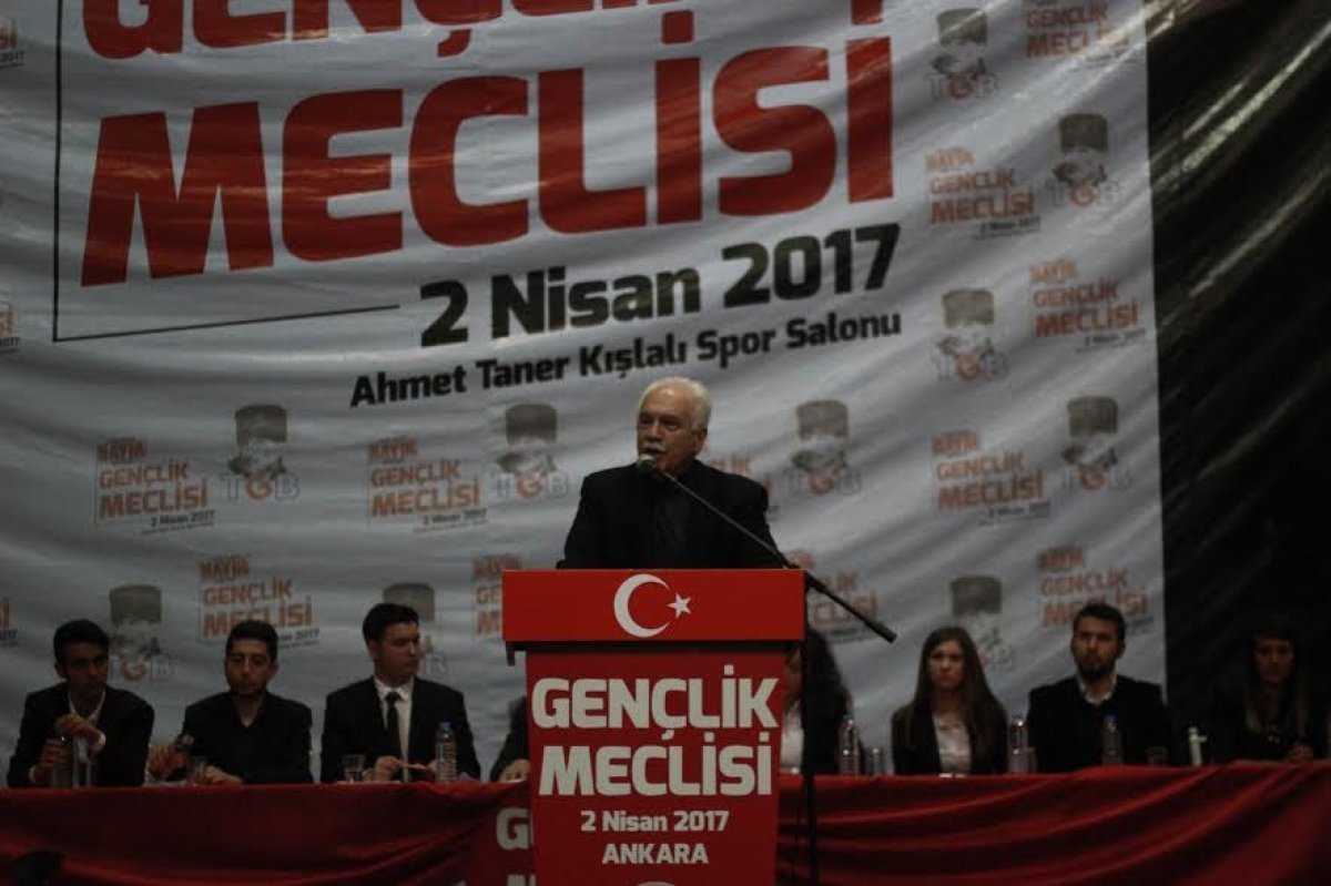 Perinçek konuşmasına, ‘‘Şimdi Gençtürkler yeniden sahnededir. TGB tarih sahnesindedir. Gençtürk payitahtın ayakları altında böcek gibi ezilmez, başı dimdik durur. Gençtürk’e hiçbir padişah, padişahım çok yaşa dedirtememiştir. Gençtürk ayaktadır. 1980lerden bu yana küresel bir saldırıyla karşı karşıyayız. Bu saldırı Türk Cumhuriyetimizi, halkçılığımızı, devletçiliğimizi, kamuculuğumuzu en başta gençliğimizi hedef alıyordu. Küresel efendiler ülkemizi bitirmek için, gençlerimizi bireyci çıkarcı yapmak istediler ama başaramadılar. İşte başaramadıklarını bu salonda, bu kararlılığınızla bu iradenizde görüyoruz. Bu küresel saldırı sizin hayır itirazınızda bir kayaya çarptı ve geri döndü. Buradan hep birlikte o küresel sistemin hepimize dayattığı cumhurbaşkanlığı sistemine hayır diyoruz. Bu bir saray anayasasıdır. Bu dayatma Türkiye’ye, milletin kabul edebileceği bir dayatma değil.’’ şeklinde konuştu.