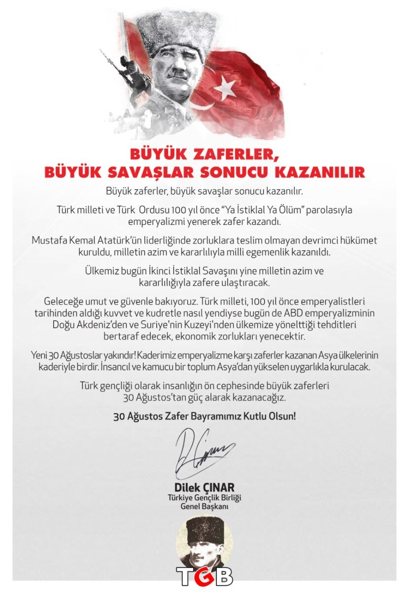 Türk gençliği olarak insanlığın ön cephesinde büyük zaferleri 30 Ağustos’tan güç alarak kazanacağız.