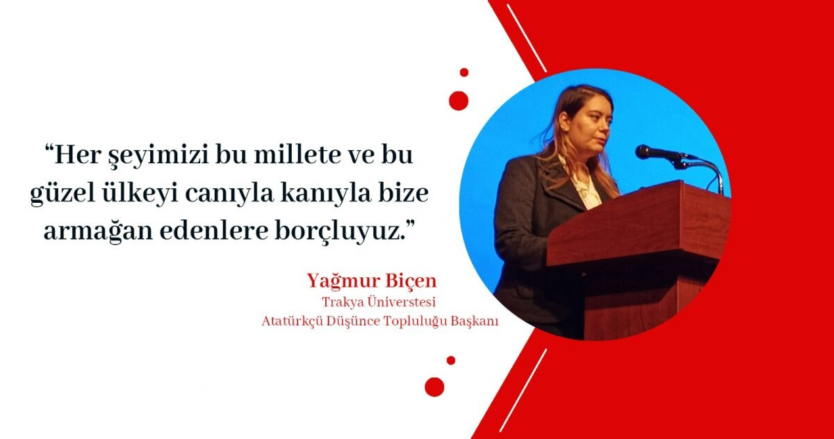 Ben Yağmur Biçen Trakya Üniversitesi Uluslararası İlişkiler Bölümü öğrencisi, Atatürkçü Düşünce Topluluğu Başkanıyım.