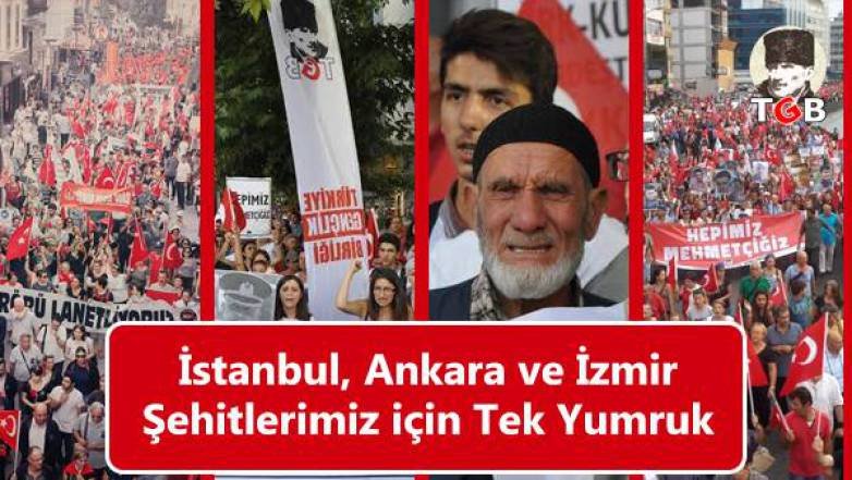 İzmir’de Kıbrıs Şehitleri Caddesi’nde başlayan yürüyüşe TGB ve TLB’nin yanısıra İzmir Barosu, İzmir Tabip Odası, CKD, ÇYDD, TOBAV, TESUD, Vardiye Bizde Platformu, İzmir Diş Hekimleri Odası Başkanı, İzmir Eczacılar Odası Başkanı, DSP ve Vatan Partisi de katıldı. Cübbeleriyle yürüyüşe gelen İzmir Barosu avukatları adına konuşma yapan İzmir Barosu Başkanı Aydın Özcan, “Ülkemizi kin ve nefret söylemleriyle kaosa sürükleyenlere karşı birlik ve bütünlük duygusuyla parçalanmayacağız. Bu topraklarda barış ve kardeşlik duygusuyla birlikte yaşayıp mücadele eden bu insanlar yine ayni bu duygularla ülkenin birlik ve bütünlüğünü korumaya devam edecektir ” diye konuştu. Yürüyüşün sonunda 9 Eylül İzmir’in düşman işgalinden kurtuluş gününde yapılacak “Teröre Lanet Mitingi”’ne çağrı yapıldı.