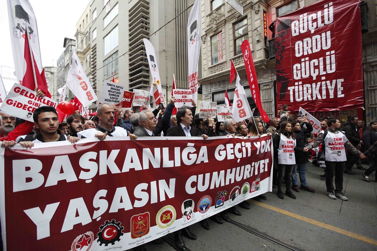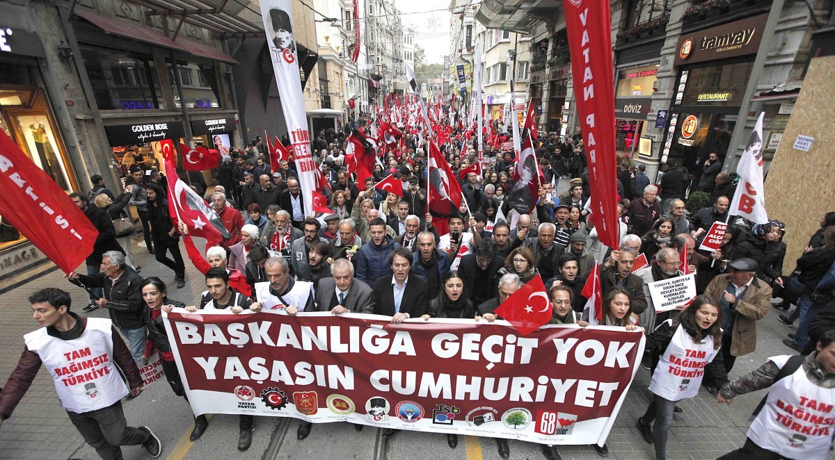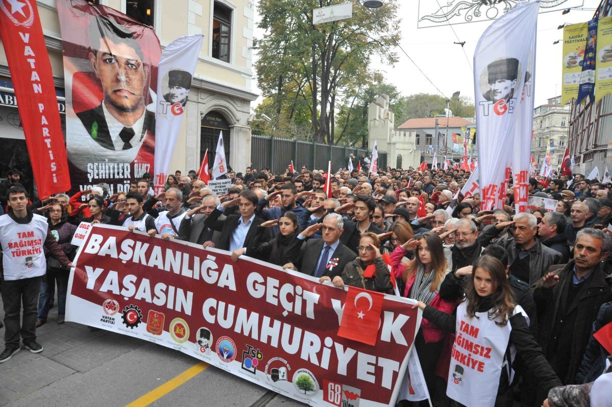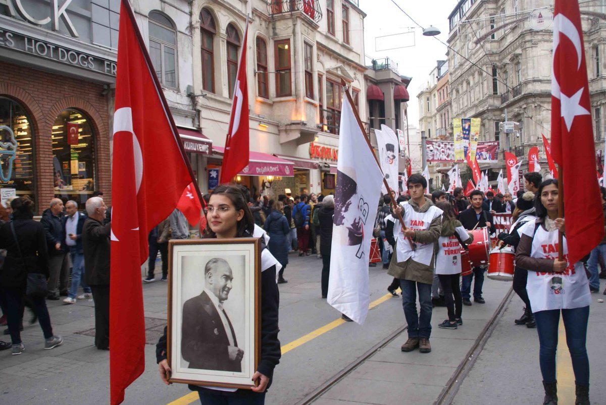 İstanbul’da 29 Ekim coşkuyla kutlandı. Türkiye Gençlik Birliği, Vatan Partisi, İstanbul İşçiler Derneği, Türkiye Muharip Gaziler Derneği, Eğitim-İş 3 ve 4 No’lu Şubeler, Türkiye Sanatçılar Birliği, Tüm Öğretim Elemanları Derneği, Türkiye Muharip Gaziler Derneği ve Diren Çınar Platformu’nun çağrısıyla İstiklal’de toplanan yurttaşlar ‘‘Başkanlığa Geçit Yok, Yaşasın Cumhuriyet’’ sloganıyla yürüdü.