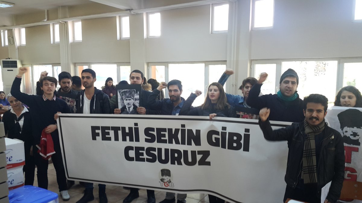 Ege Üniversitesi’nde 1 Nolu Yemekhane’de gerçekleştirilen anmada TGB İzmir İl Yöneticisi Ümit Çalışkan, “Geçen yıl bugün İzmir Adliyesi önünde PKK tarafından haince bir saldırı gerçekleştirilmek istendi. Bu saldırı ile milletimizi bölmeyi amaçladılar. Ancak hedeflerine ulaşamadılar. Bu teröristlerin karşısında milletine göğsünü germiş Fethi Sekin vardı. Fethi Sekin, gözünü bile kırpmadan bu hainlere karşı kahramanca direnmiş ve şehit olmuştur” dedi.