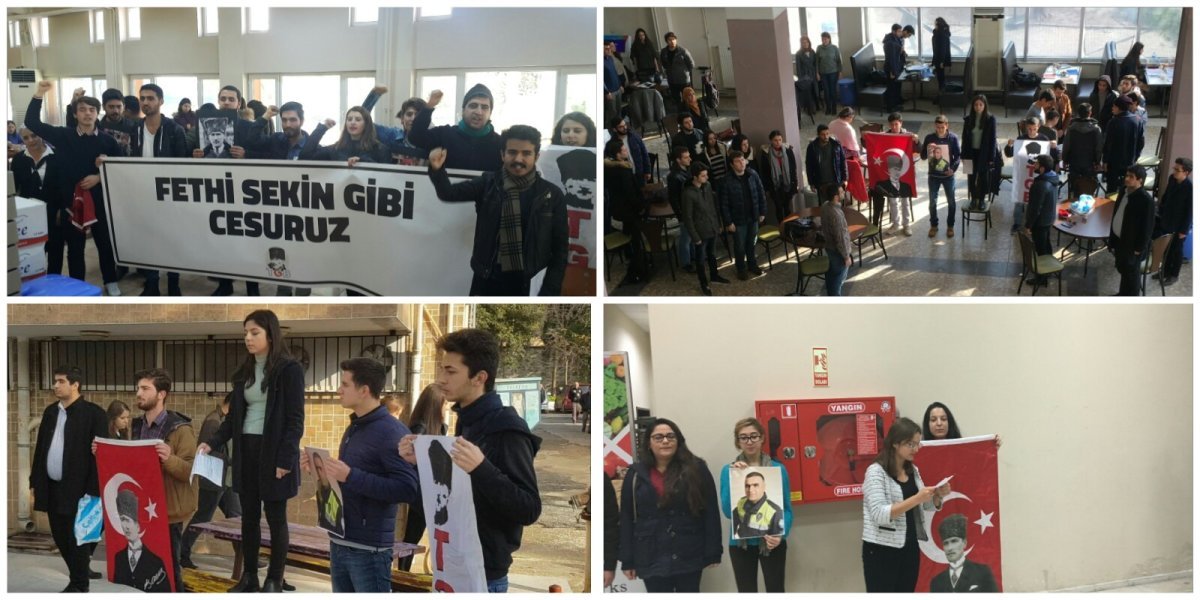 Geçtiğimiz yıl 5 Ocak’ta İzmir Adliyesi’nde gerçekleştirilen terör saldırısında Trafik Polisi Fethi Sekin ve Mübaşir Musa Çam şehit olmuştu. Terör saldırısının üzerinden bir yıl geçmesine rağmen Atatürk gençliği olarak şehitlerimizi unutmadık. Ege Üniversitesi, Dokuz Eylül Üniversitesi ve Katip Çelebi Üniversitesi’nde Fethi Sekin’i anan İzmir İl Örgütümüz, kampüslerde basın açıklamaları yaptı. Saygı duruşunda bulunduktan sonra İstiklal Marşı’nı okuyan gençlerin ellerinde taşıdıkları Fethi Sekin posterleri dikkat çekti. Fethi Sekin için yapılan anmalara yoğun bir şekilde katılım gösteren öğrenciler, anmaya alkışlarla destek verdi.