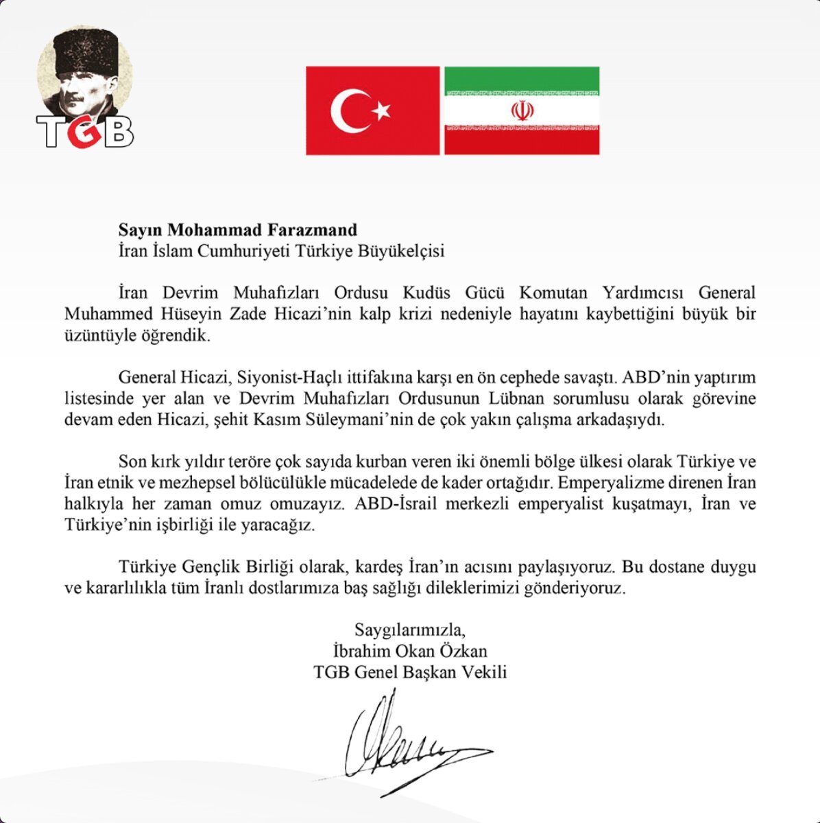 Türkiye Gençlik Birliği olarak, kardeş İran’ın acısını paylaşıyoruz. Bu dostane duygu ve kararlılıkla tüm İranlı dostlarımıza başsağlığı dileklerimizi gönderiyoruz.”