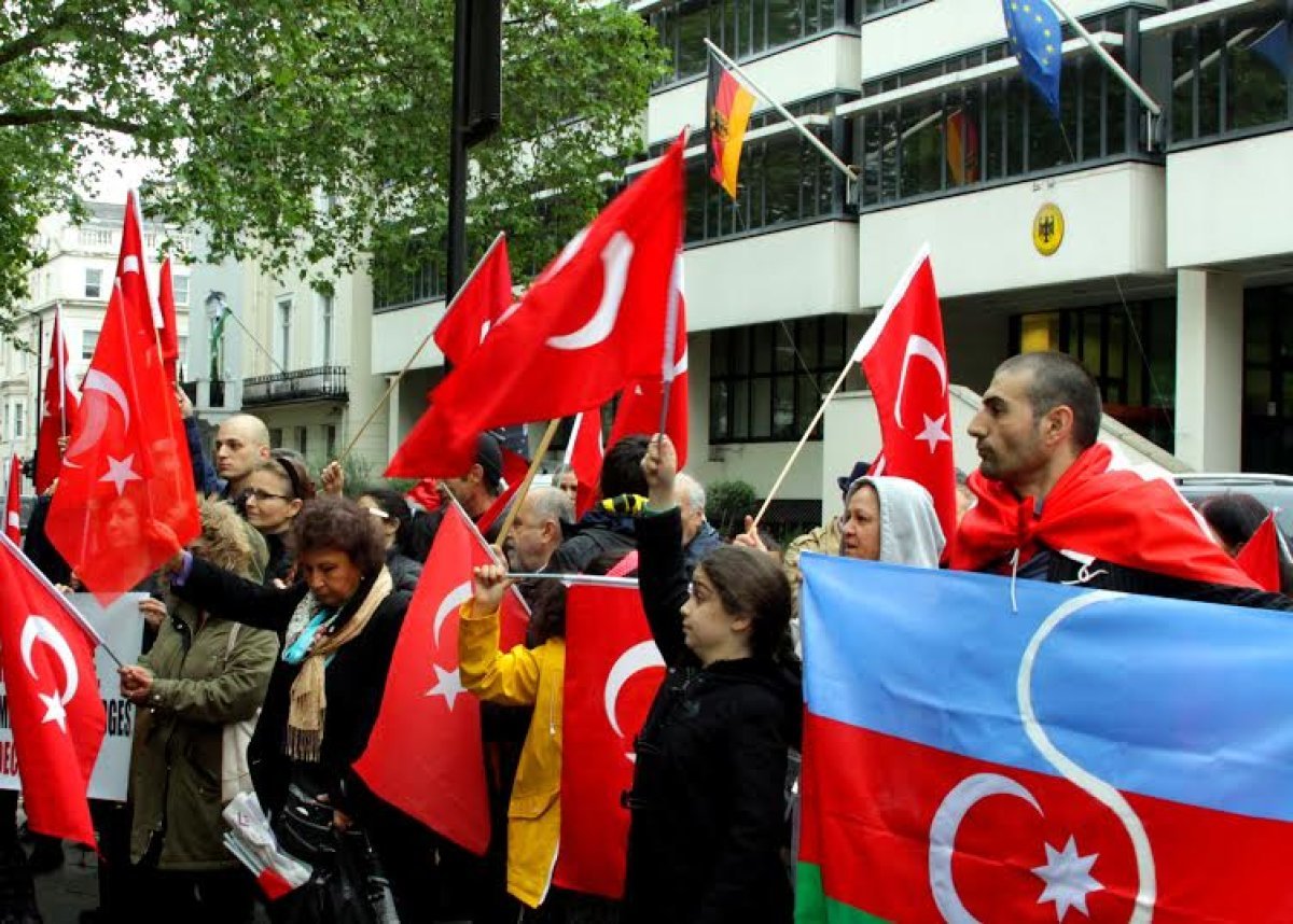 Almanya Federal Meclis’inde oylanan sözde Ermeni soykırımı karar tasarısı için, İngiltere Atatürkçü Düşünce Derneği (İADD), İngiltere Türk Öğretmenler Derneği, Londra Cumhuriyetçi Kadınlar Derneği, Türkiye Gençlik Birliği (TGB) İngiltere, Uluslararası Türk Kadınları Derneği, Vatan Partisi İngiltere Temsilciliği dahil olmak üzere 14 dernek ve sivil toplum örgütü, Londra’daki Almanya Büyükelçiliği önünde protesto eylemi gerçekleştirerek Almanya Federal Meclisi’ne Avrupa İnsan Hakları Mahkemesi (AİHM) kararlarını hatırlattı.