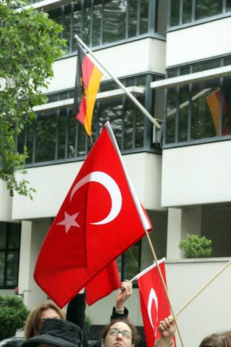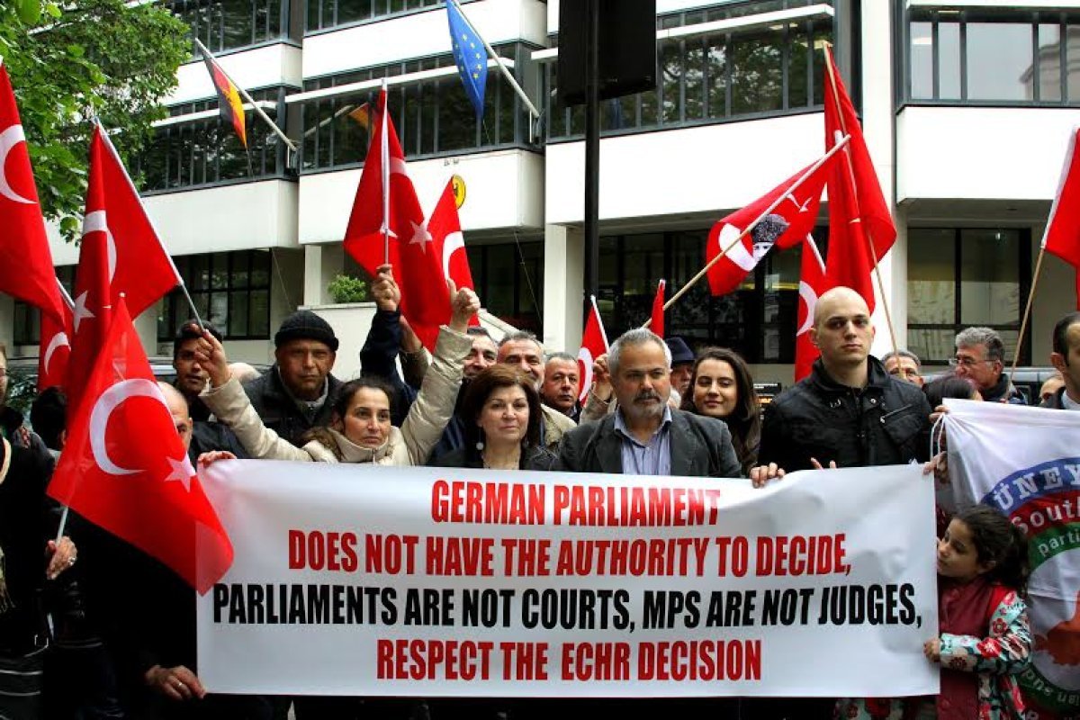 Almanya Büyükelçiliği önünde bir araya gelen katılımcılar üzerinde “Alman Federal Meclisi yetkili değildir. Parlamentolar mahkeme değildir, milletvekilleri yargıç değildir ve AİHM kararına saygıya davet ediyoruz” şeklinde İngilizce yazılmış büyük bir pankart taşıdılar.