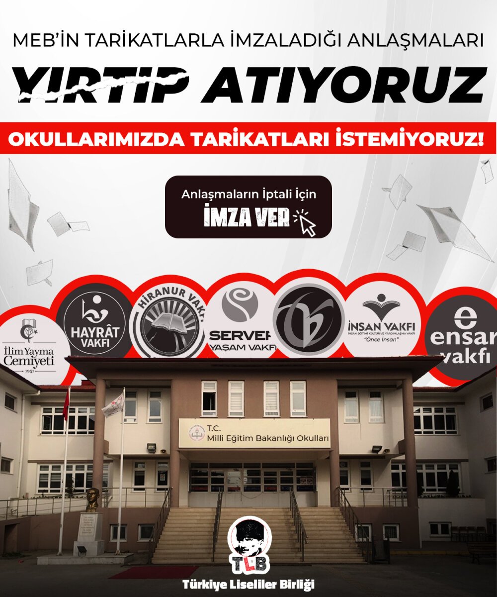 Milli Eğitim Bakanı Yusuf Tekin’e de çağrı yapan TLB, Cumhuriyetimizin kurduğu okullarda, Cumhuriyet ve aydınlanma karşıtı, ileride devlete tehdit oluşturabileceği açık olan, daha önce FETÖ örneğinden de bilindiği gibi tarikatların bozuk ve karanlık fikirlerine karşı Milli Eğitim Bakanlığı ve Bakan Tekin’i göreve çağırdı. kampanya linki TLB Başkanı Elif Yılmaz, “Türkiye’nin geleceği olan biz gençleri, tarikat tehlikesiyle baş başa bırakan bu protokollerin iptali için imza kampanyası başlatıyoruz. Okullarımızda tarikat ve cemaatleri istemeyen tüm liselileri imza atmaya ve bu imza kampanyasını büyütmeye çağırıyoruz.” dedi. Milli Eğitim Bakanlığı önünde 23 Aralık’ta açıklama yapacak TLB’liler, liselileri harekete geçmeye çağırdı.