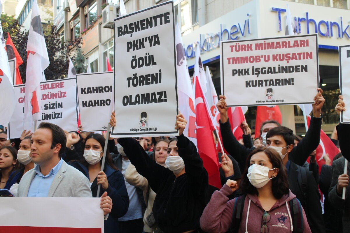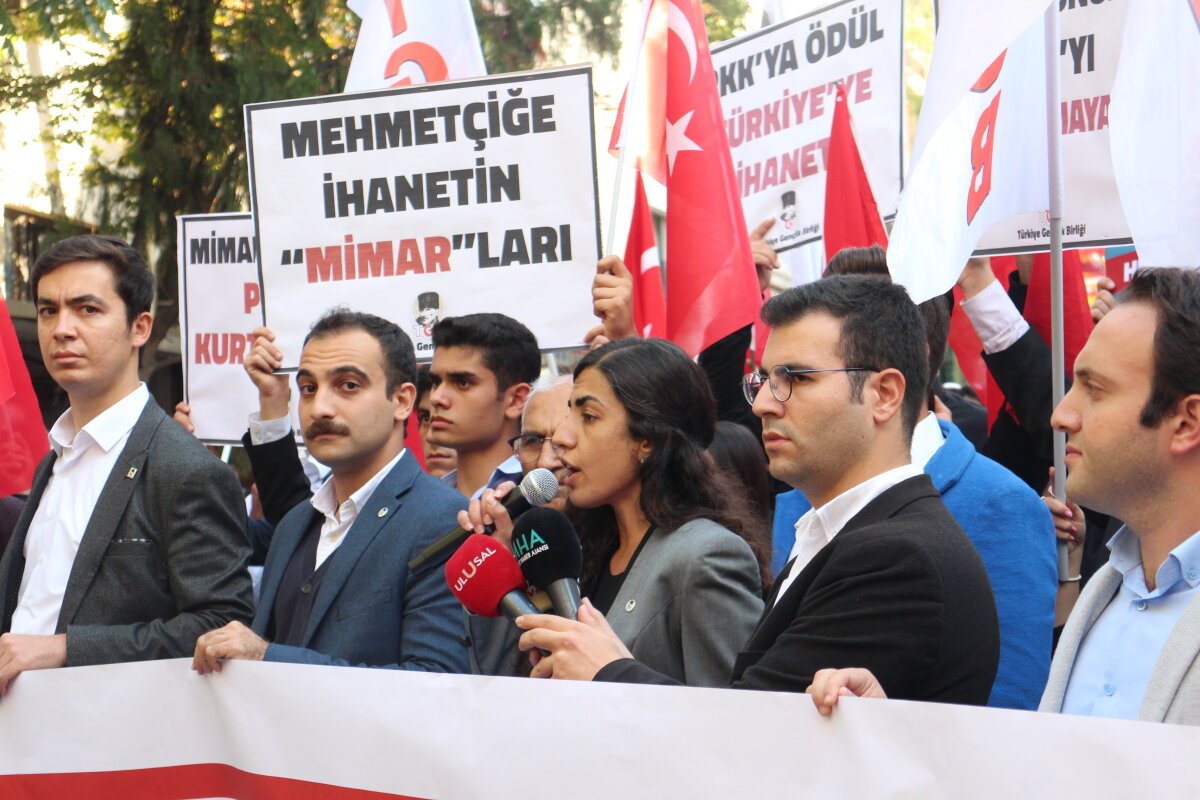 “Mimarlar Odası PKK’yı Kurtaramaz. PKK’ya Tek Ödül Mehmetçiğin Namlusudur!” pankartı taşıyan yüzlerce genç, Ankara Mimarlar Odası önüne yürüdü. Mimarlar Odası Ankara Şubesi önünde Türkiye Gençlik Birliği adına açıklamayı yapan TGB Genel Başkanı Dilek Çınar, PKK’ya ödül veren Mimarlar Odası Ankara Şubesinin işgal edildiğini vurgulayarak bu ödülün şehitlere kurşun sıkanlara verildiğini dile getirdi ve şunları söyledi:
